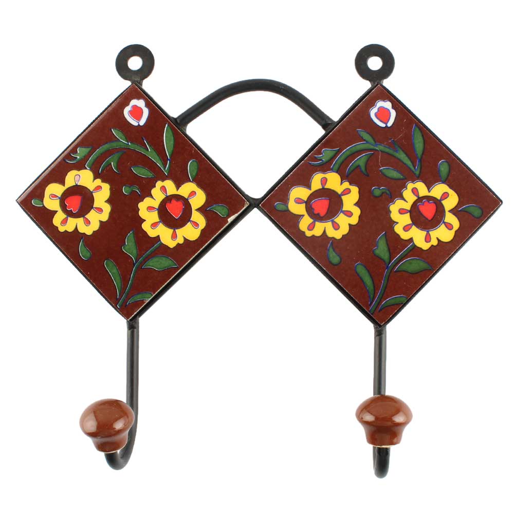 Brown Base Yellow Tiny Flower Ceramic Tile Hook. When Put on Wall or Cabinet It is An Art in Itself. The Metal Part of this Hook is Black Powder Coated.