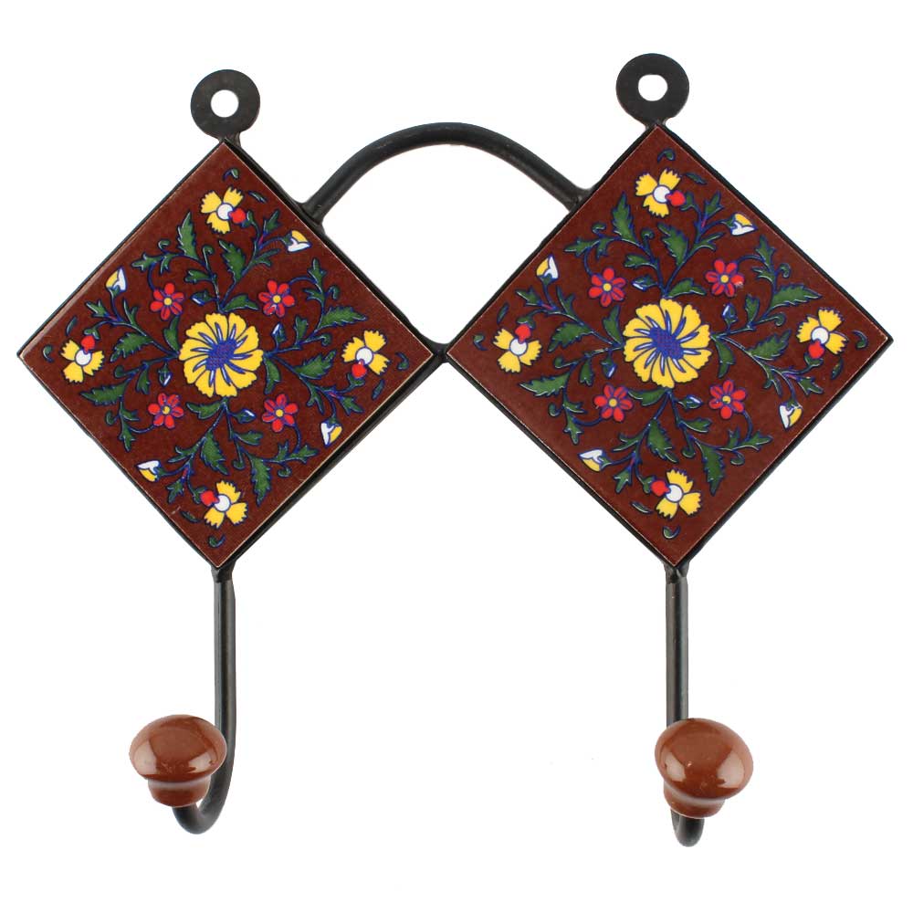 Brown Ceramic Floral Tile Hook. When Put on Wall or Cabinet It is An Art in Itself. The Metal Part of this Hook is Black Powder Coated.