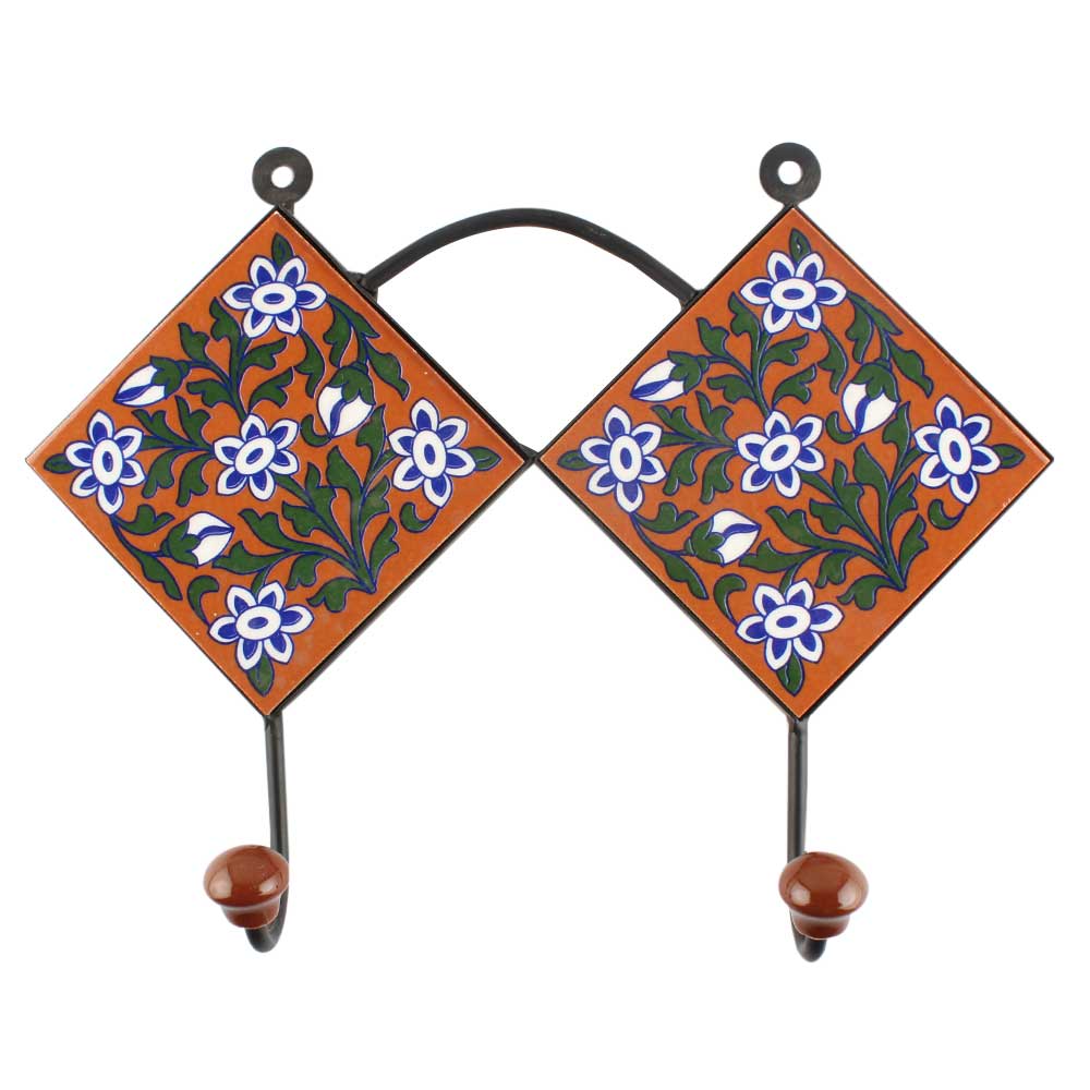 Brown Ceramic Floral Tile Hook Online. When Put on Wall or Cabinet It is An Art in Itself. The Metal Part of this Hook is Black Powder Coated.