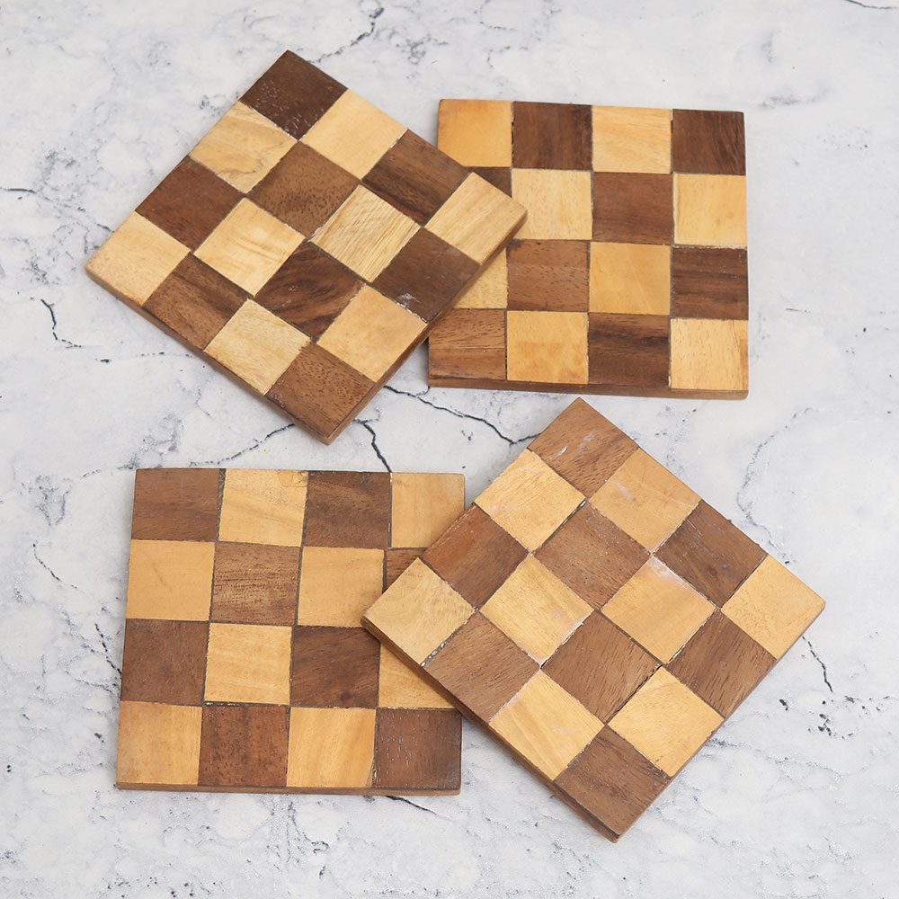 A Pack of 4 wooden coasters that is expertly crafted from premium-quality wood and handmade by highly talented artisans from India. These coasters feature a charming square shape, adorned with a mesmerizing brown check pattern in an antique finish. Not only are they functional, but they also serve as captivating decorative pieces for your home or office. Our wooden coaster sets are designed to hold water, tea, juice, or coffee glasses, providing a protective barrier against unsightly stains on any surface. Whether you\'re at home, in the office, or enjoying a meal at a restaurant, hotel, or cafe, these coasters are the perfect companions for any beverage. These coasters make an excellent gift for your loved fours on special or festive occasions, showcasing your thoughtfulness and appreciation for fine craftsmanship. With their blend of functionality and aesthetic appeal, our wooden tea coaster set truly stands out as the best choice for both practicality and style.