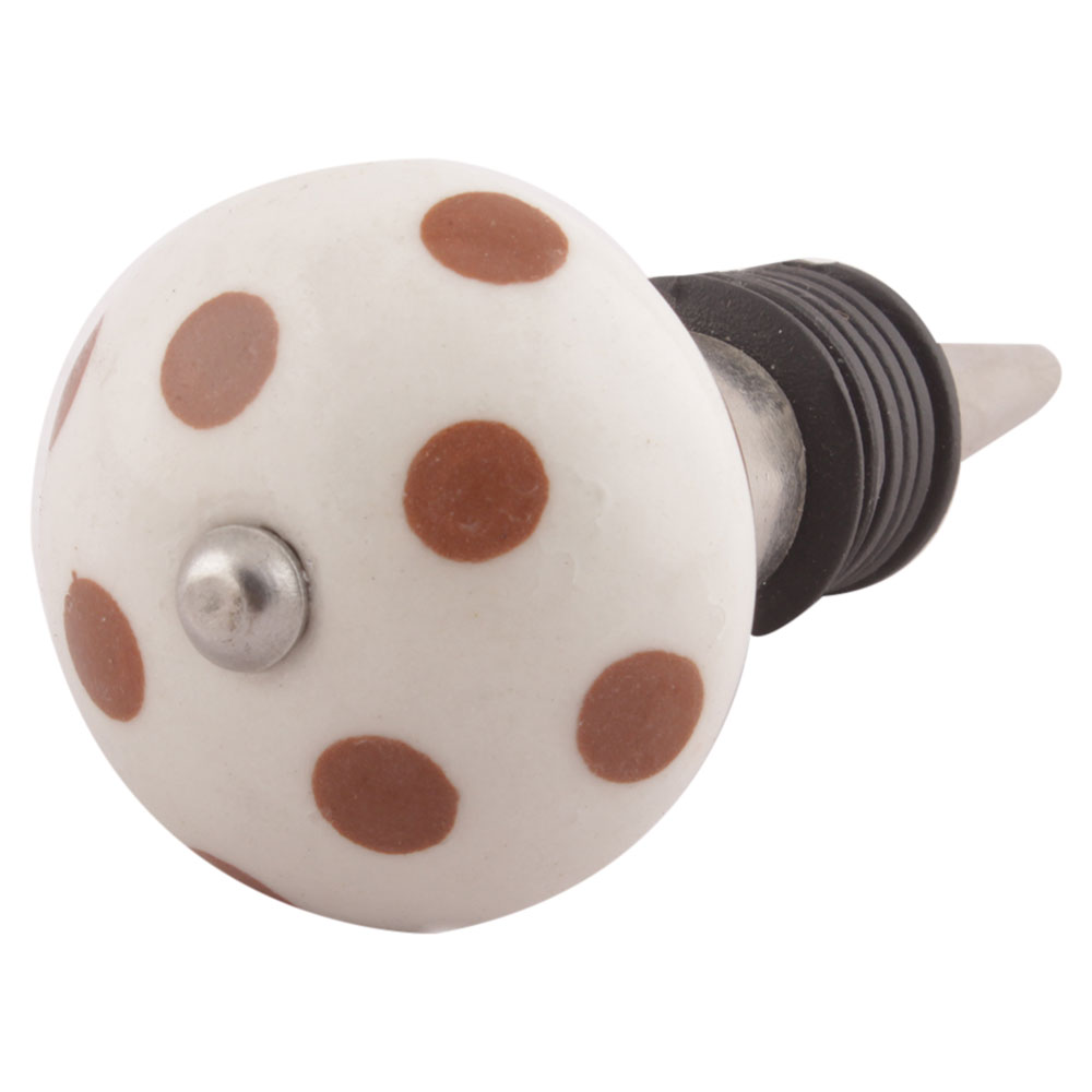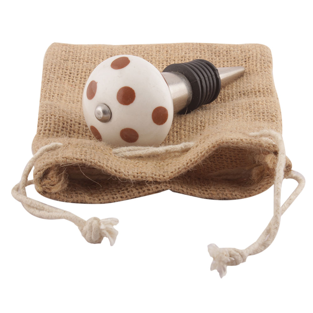 Brown Dotted Ceramic Floral Wine Stopper. Zinc Alloy Wine Bottle Stopper with Attractive Jute Bag Packaging.