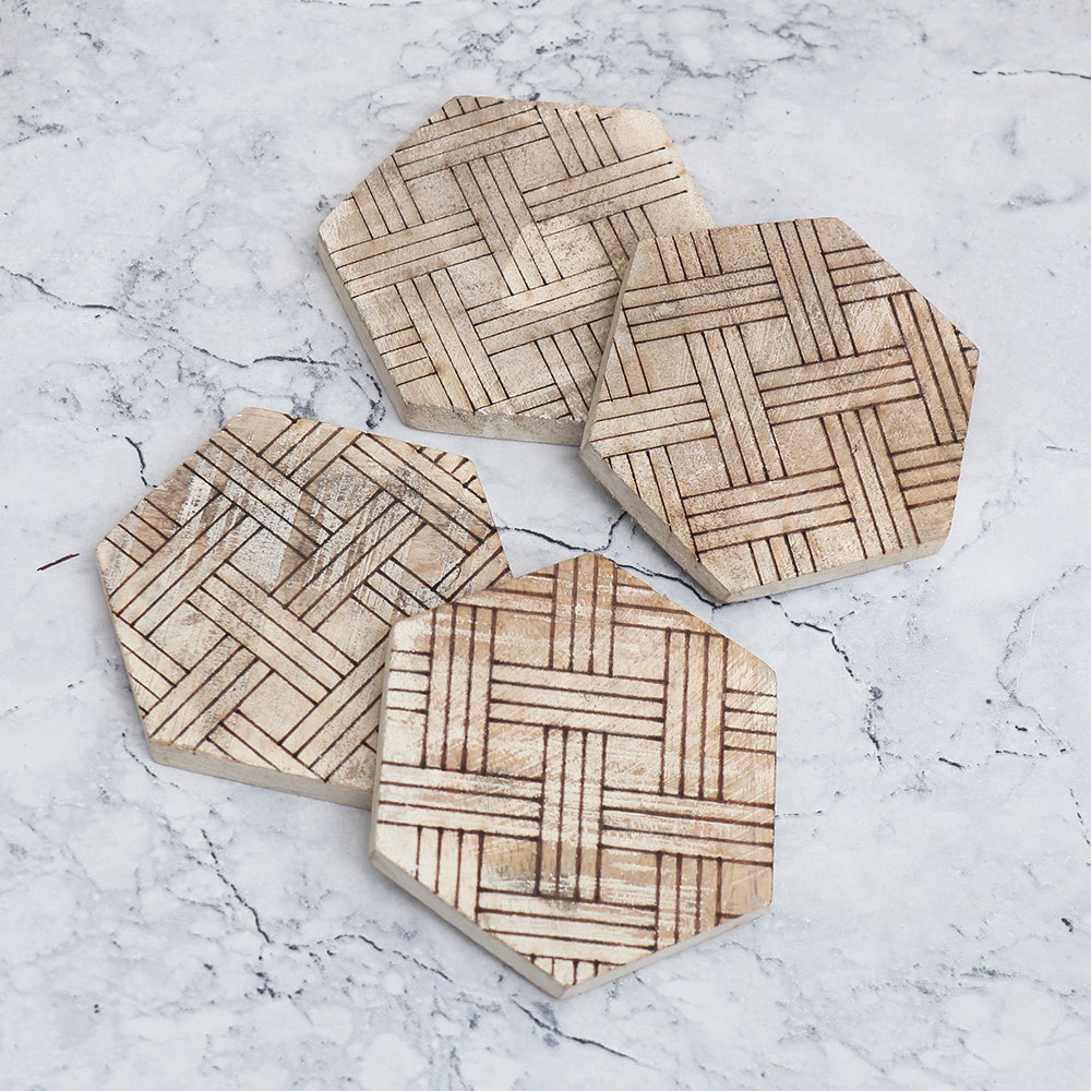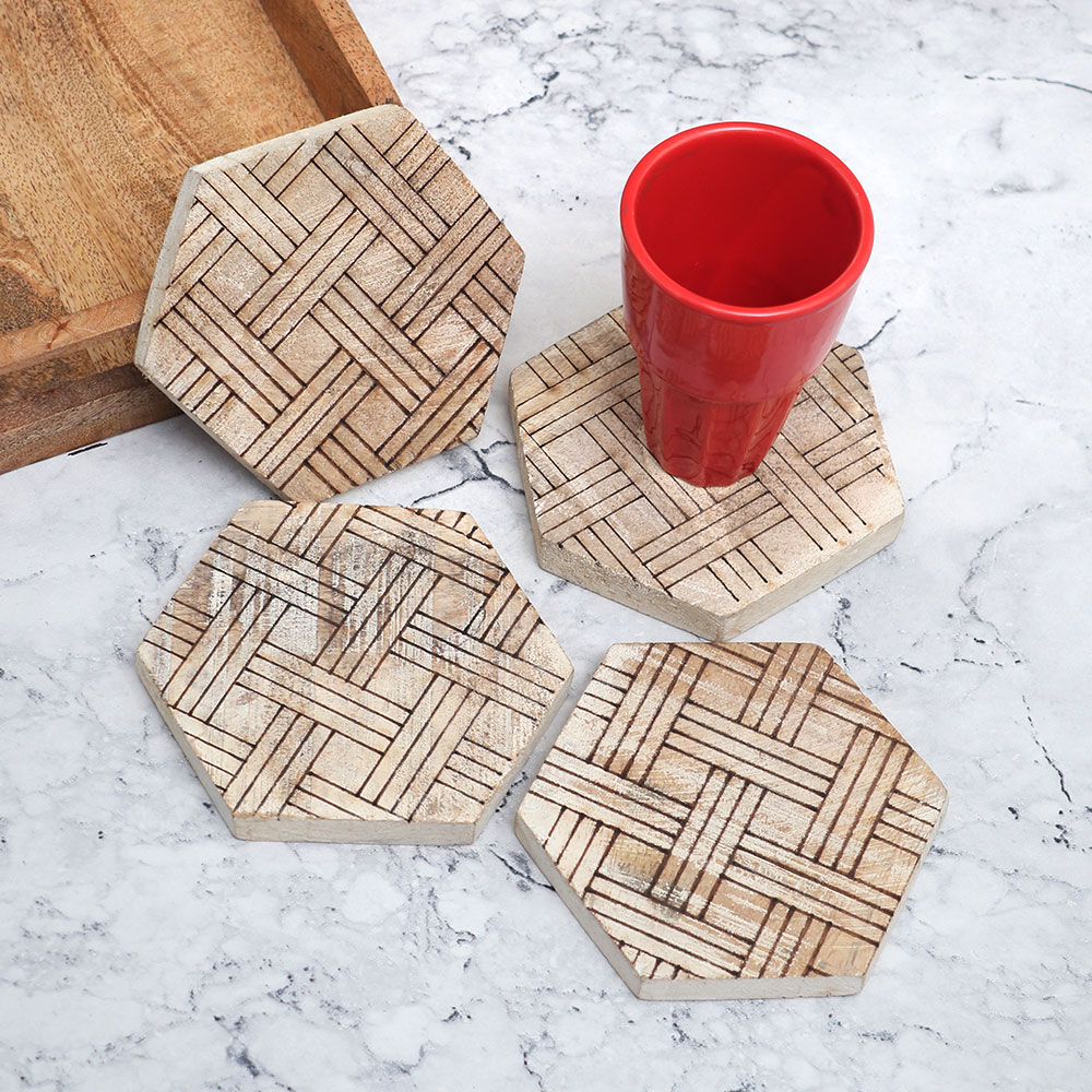 Buy a finest collection of handmade wooden coasters online and get a hassle free delivery at your doorstep. This exquisite Pack of 4 hexagon-shaped coasters is crafted from premium-quality wood by highly skilled Indian craftsmen. The natural beauty of the wood is enhanced by a rich brown pattern and an antique finish, adding a touch of elegance to any space. As the best wooden coaster option available, this set is not only a functional accessory but also a stunning decorative piece for your home or office. Its versatile design allows it to hold water, tea, juice, or coffee glasses, protecting your surfaces from unsightly stains. Whether used in a home, restaurant, hotel, or cafe, these coasters offer a stylish solution to your beverage needs. This handmade wooden coaster set is perfect for gifting on special or festive occasions, showcasing your appreciation for quality craftsmanship.