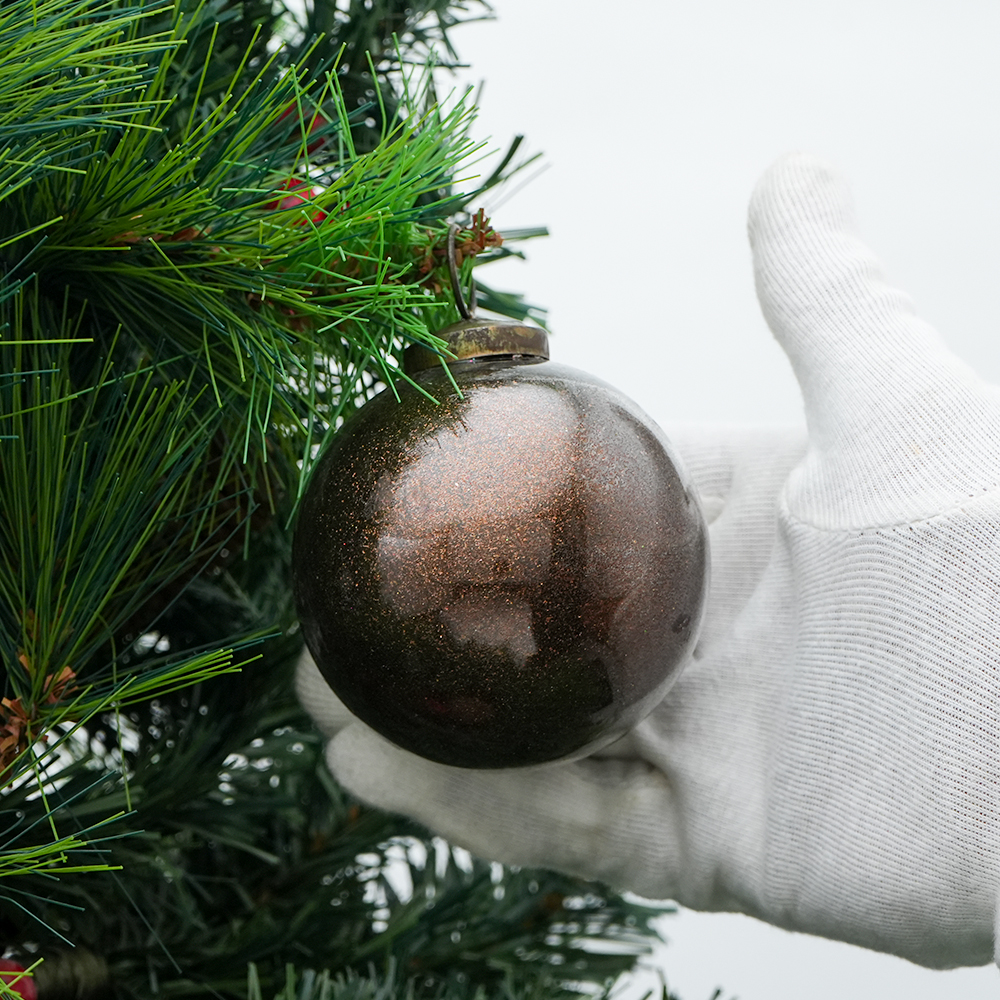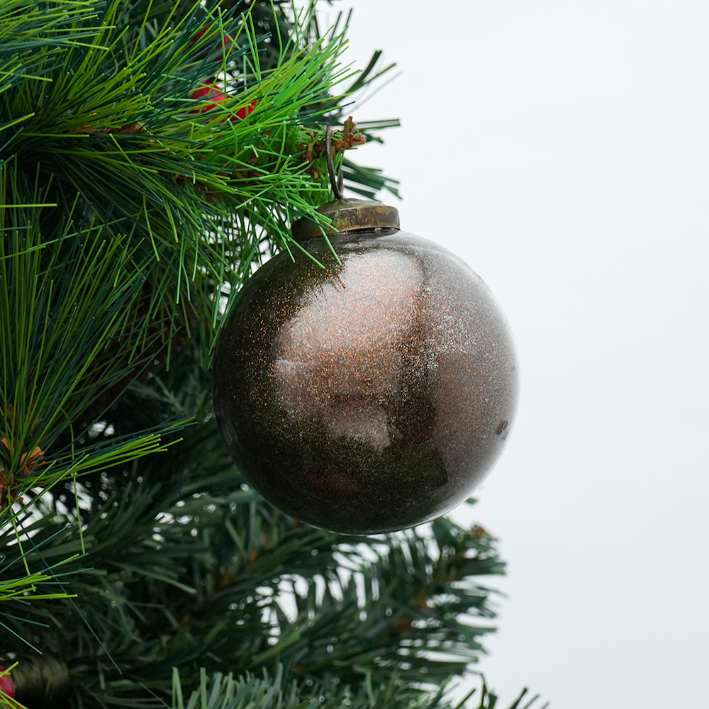 Brown Round Glass Hanging Ornament For Christmas Tree. Crafted from high-quality glass with a smooth glossy finish, this decorative bauble adds a classic and festive touch to Christmas trees, wreaths, and holiday displays.