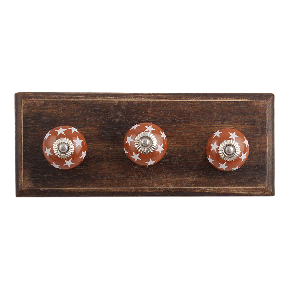 Brown Star Ceramic Wooden Hook. A Perfect Complement to the Soft Tone of the Wood are these White Traditional Hat & Coat Hook Made of Genuine Porcelain and Brass. It can be use to Hang Jewellery, Leashes, Towels, Scarves, Light Weight Sweaters, Caps Etc.