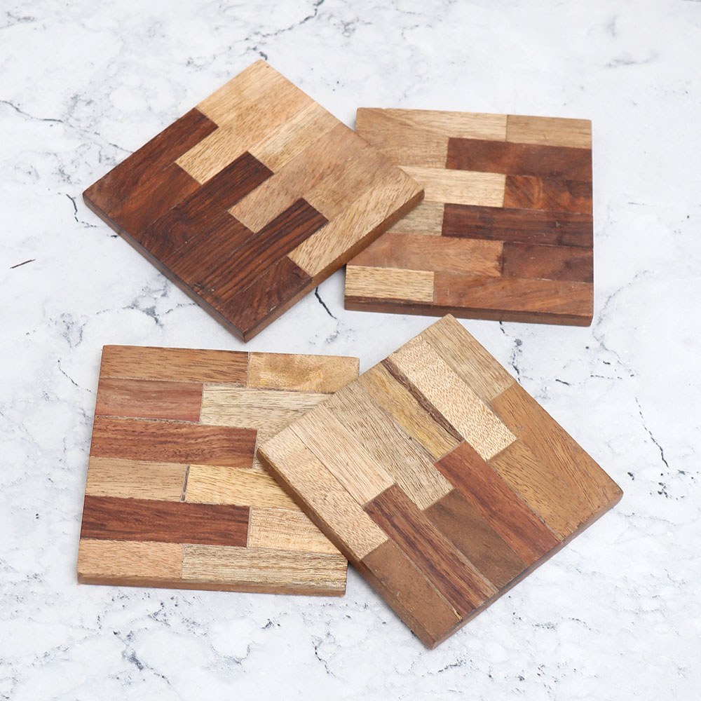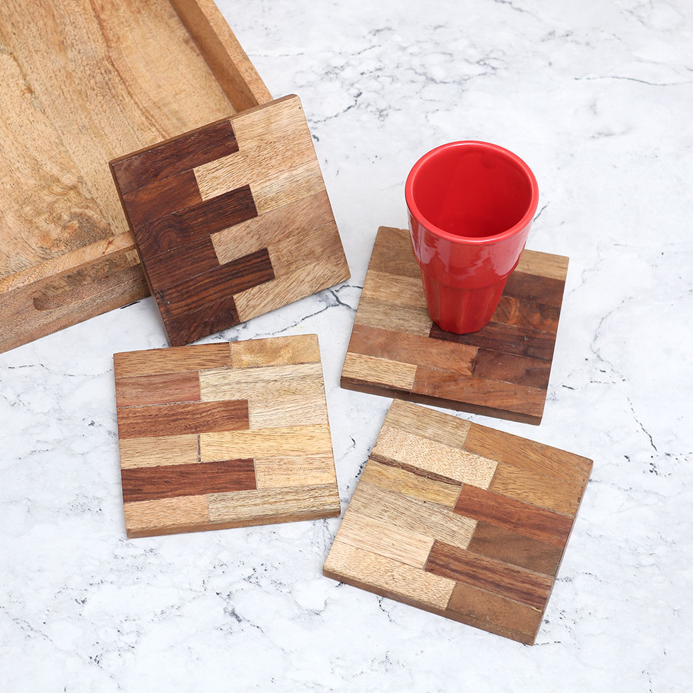 Buy a Pack of 4 wooden coasters online that is handcrafted with precision and artistry by highly skilled and experienced Indian artisans. These wooden coaster sets are crafted from the finest quality wood, ensuring durability and elegance in every piece. With their square shape and vintage-style design, they add a touch of sophistication to any space, making them a perfect decorative item for your home or office. Each coaster in this wooden tea coaster set features a unique pattern of different shades of brown, enhancing their visual appeal and adding a charming rustic touch. Their sturdy construction makes them suitable for holding water, tea, juice, or coffee glasses, providing a protective barrier against unwanted stains on your surfaces. These wooden coasters are versatile and suitable for various settings, including homes, offices, restaurants, hotels, and cafes. They also make for an excellent gift option for your family, friends or relatives on special or festive occasions, showcasing your thoughtfulness and appreciation for quality craftsmanship.