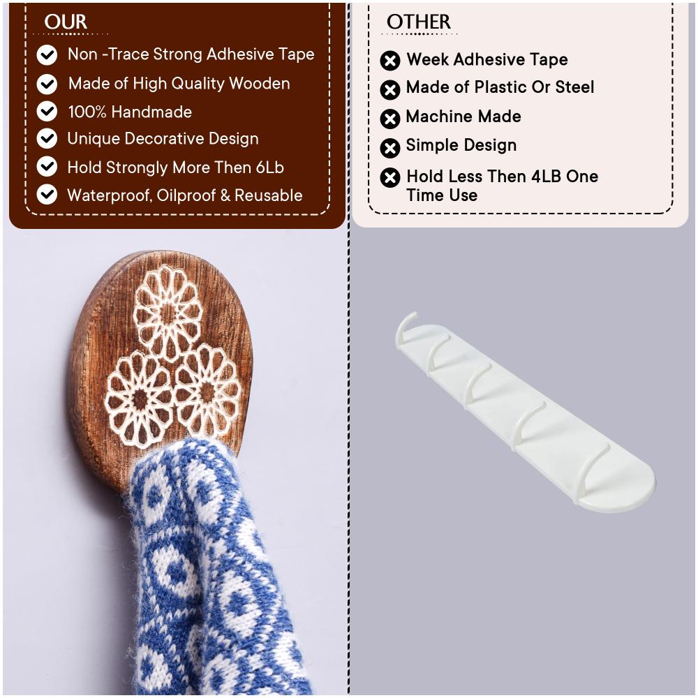 Handmade adhesive wooden wall hook is perfect for hanging towels, clothes, hats, bags, keys, scarves and jackets. It's very easy to mount on a wall or door.
