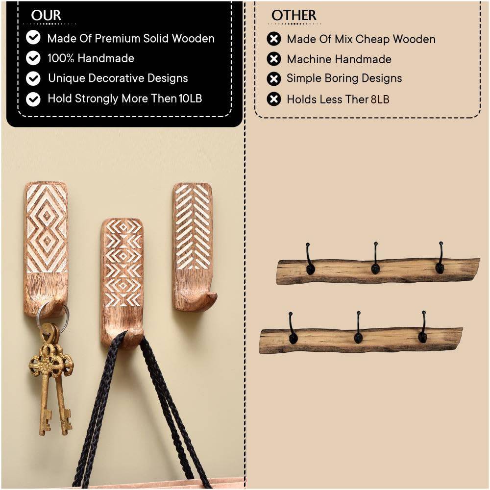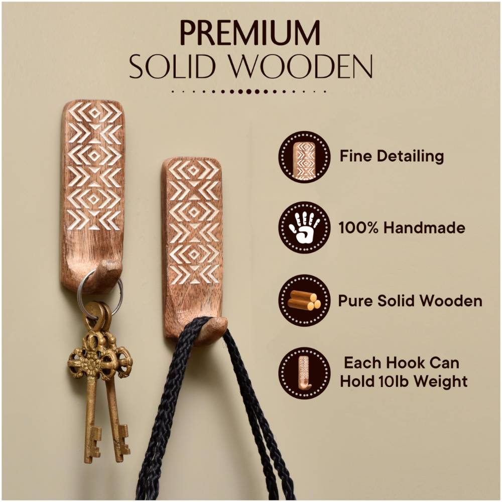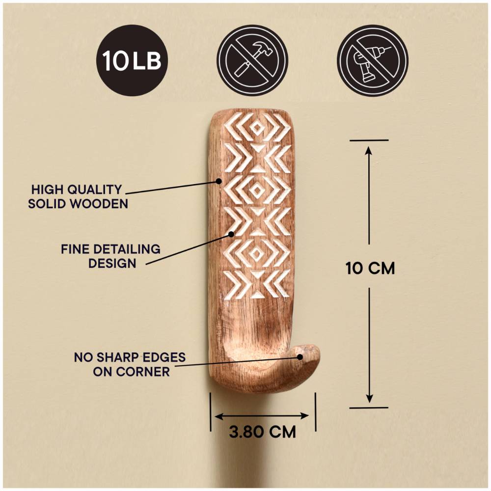A set of 3 Brown Wooden Wall Hooks with a captivating White Colour Pattern that is meticulously handcrafted by skilled Indian artisans. Each hook is a testament to craftsmanship, carved from high-quality wood to ensure durability and a touch of elegance in your living space. Designed with functionality in mind, these hooks serve as versatile organizers for your home. The white colour pattern, delicately engraved on the rich brown wooden surface, adds a touch of sophistication to any room. Their multipurpose design makes them perfect for hanging towels, clothes, hats, bags, keys, scarves, and jackets, providing an organized and clutter-free environment. These hooks are not only aesthetically pleasing but also practical. The heavy-duty adhesive used ensures a secure attachment to your wall, offering a hassle-free installation process without the need for drilling or additional hardware. The Adhesive Wall Hooks are the epitome of convenience, catering to your storage needs with style. Surprise your loved ones on special or festive occasions with this thoughtful and practical gift. These Adhesive Hooks, with their blend of functionality and artistry, make for a unique and charming present that adds a touch of warmth to any home.