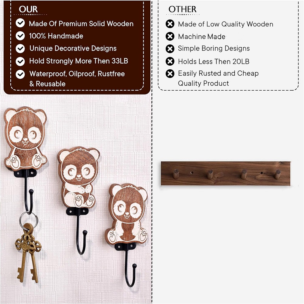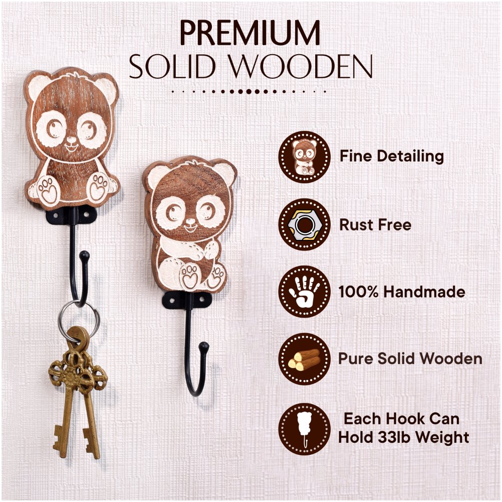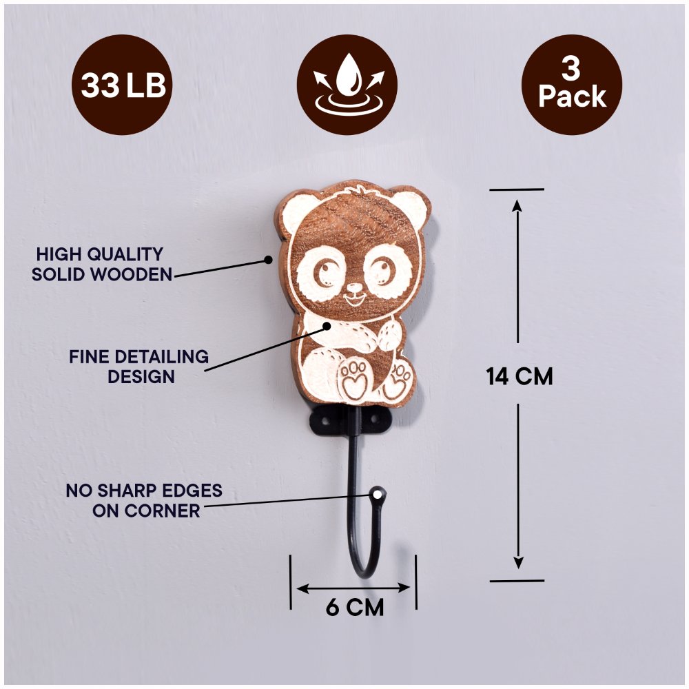 An Adorable Wooden Kids Hook Pack of 3 in a delightful brown colour. These hooks are designed in the shape of cute pandas, making them a charming addition to any kid’s room. Crafted with precision and care by highly skilled artisans from India, these hooks are made from high-quality wood, ensuring durability and long-lasting use. These versatile hooks serve multiple purposes, making them perfect for kid’s bathroom towel hooks, modern towel hooks, or coat hooks for kids. Hang towels, clothes, or bags effortlessly, keeping the space tidy and organized. Mounting these hooks on the wall is a breeze, thanks to their user-friendly design. Not only do these hooks serve a practical purpose, but they also add an aesthetic touch to the interior. With their delightful panda shape and rich brown colour, they effortlessly enhance the overall decor of the room. Transform your kid’s room into a captivating space with these incredible wooden hooks. Their unique design and exceptional quality make them an ideal choice for any young adventurer's abode.