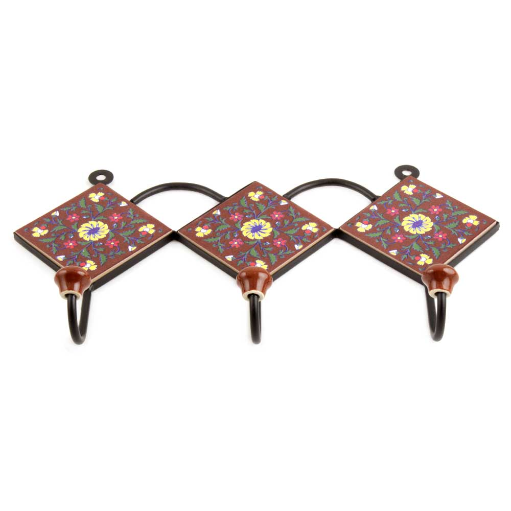 Brown Yellow Flower Tiles Hook. When Put on Wall or Cabinet It is An Art in Itself. the Metal Part of This Hook is Black Powder Coated.