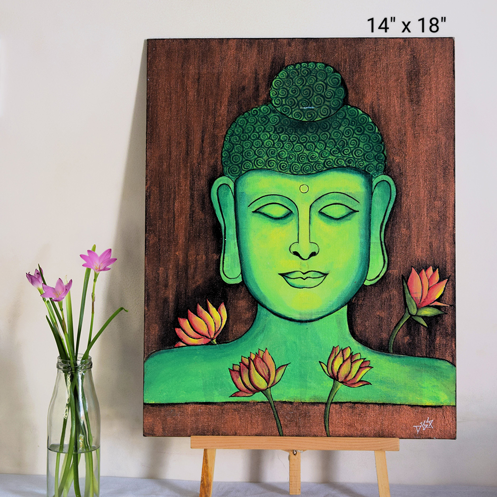 A serene acrylic painting of Buddha in vibrant green tones, symbolizing peace, healing, and growth. Set against a rich textured brown background with blooming lotus flowers, this canvas board artwork by Artist Dimpana brings a calming spiritual essence to any space. Ideal for meditation corners, living rooms, or mindful interiors seeking tranquility and balance.