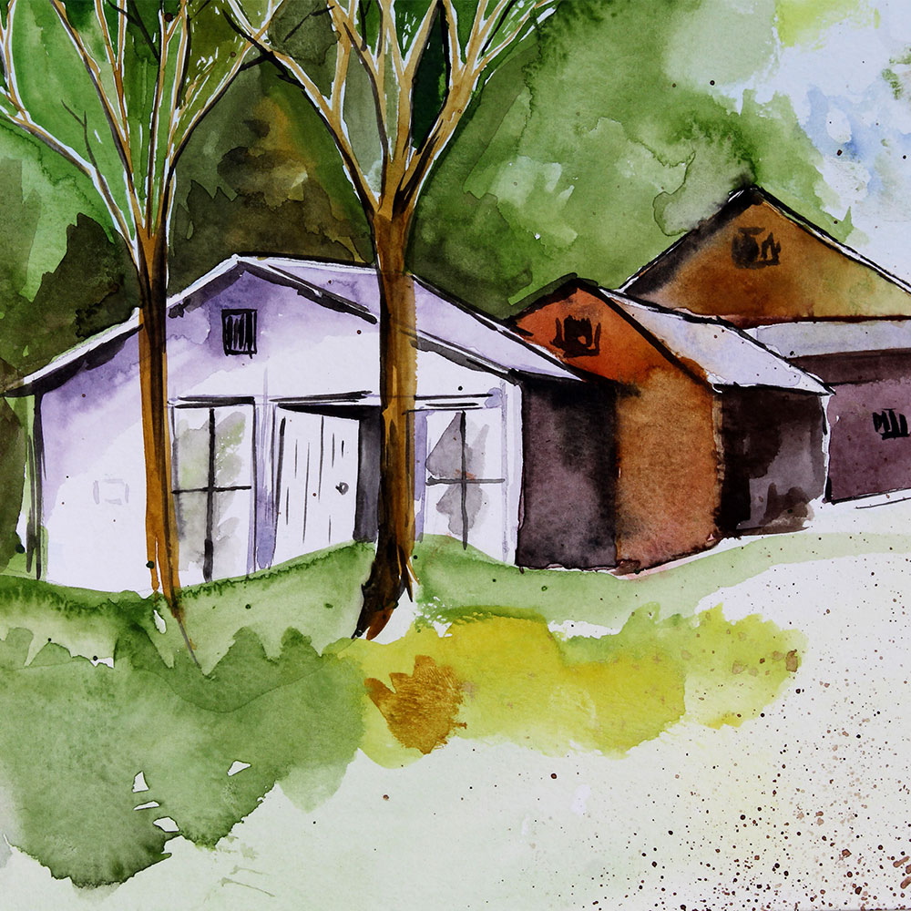 A refreshing water colour painting created with the magic of cool earthy watercolours depicts a typical hut with beautiful lush greenery in the background.