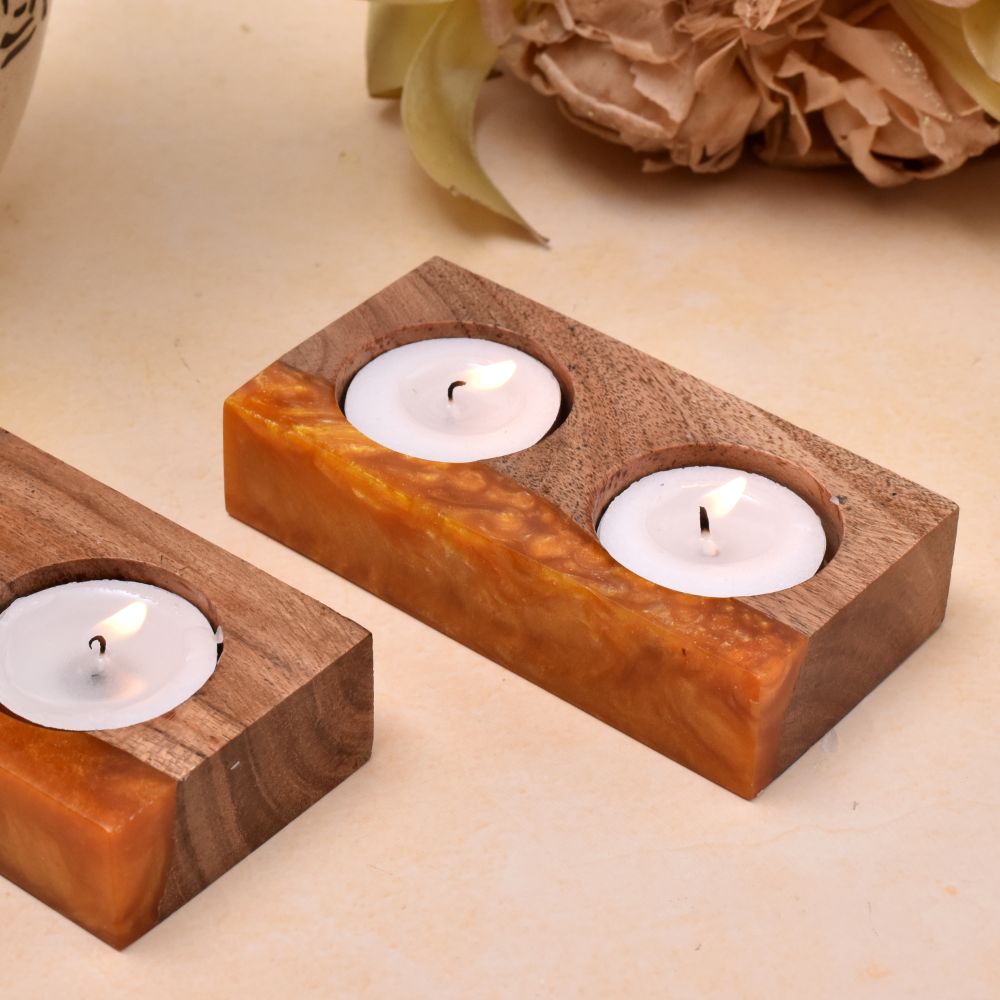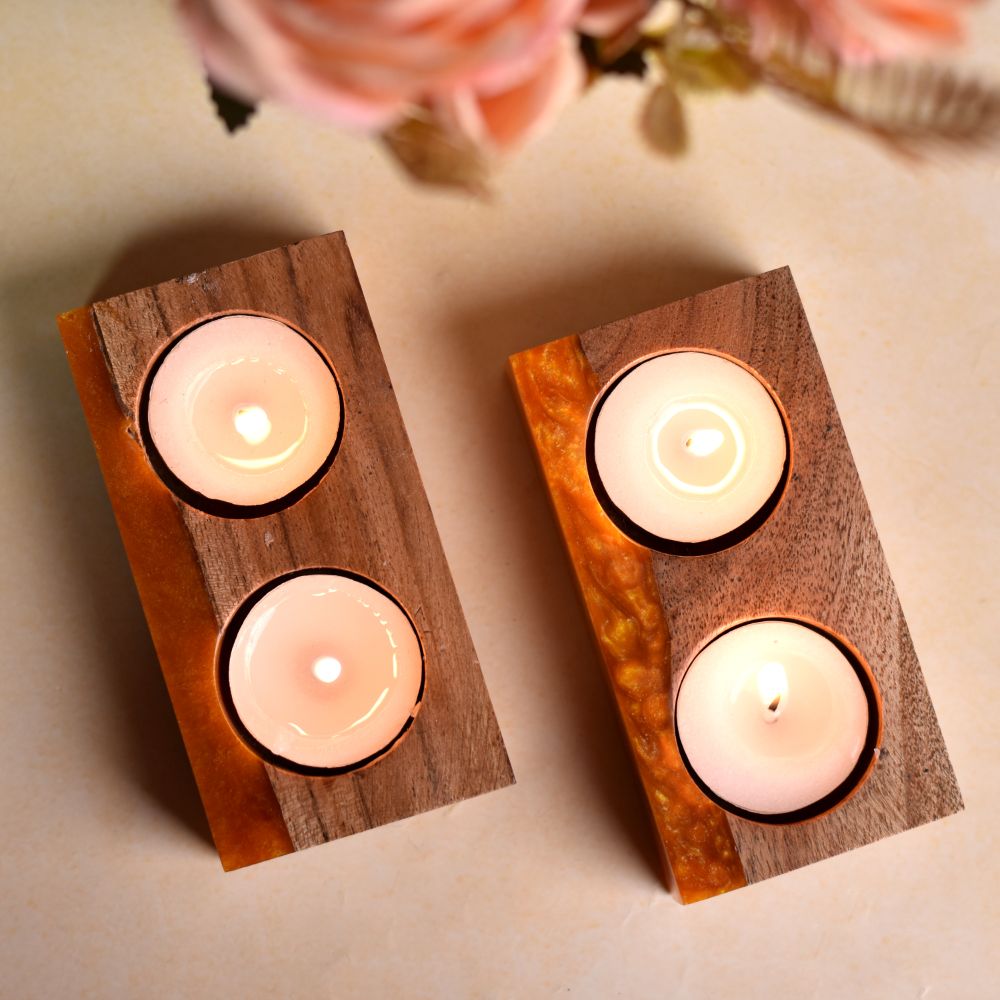This magnificent twin candle holder is produced by hand from a mixture of wood and transparent orange epoxy resin, and it will make the ideal house centrepieces and provide the ideal ambiance for the space. The size of this unusual tealight candle holder is fits two typical tea lights around. Ideal for standard votive and tealight candles as well as battery-operated flameless candles, this accessory is a wonderful addition to any space, be it a coffee table, dining table, kitchen countertop, fireplace mantle, shelf, sideboard, home bar, or even the bathroom next to your bathtub. Simple tea lights may be transformed into an intriguing and lovely piece of décor by adding resin to the natural form of the wood. This is the greatest present for a wedding, anniversary, birthday, housewarming, Thanksgiving, Christmas, Father's Day, Mother's Day, and other occasions.