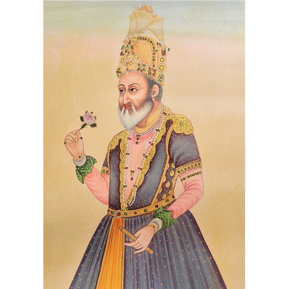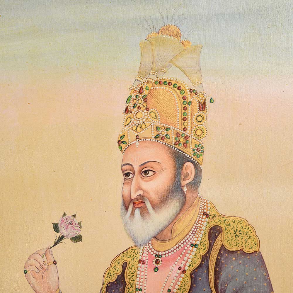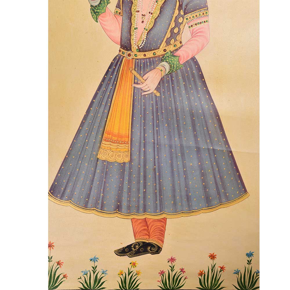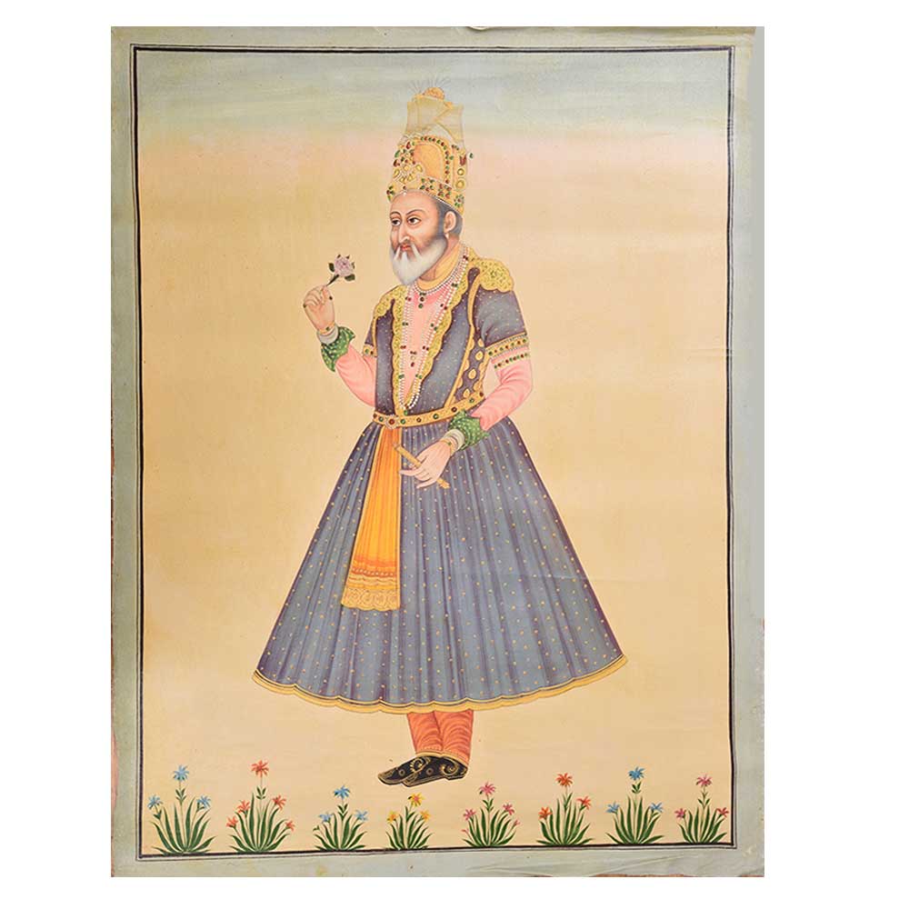 This Canvas Mughal painting shows emperor shah jahan in formal dress. He has a flower rose in one hand and rose is a symbol of the Mughal royal family, which represents the supremacy, power and authority of the dynasty.