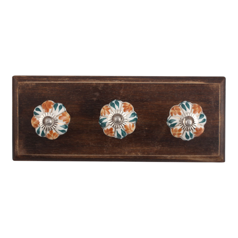 Caramel Plant Ceramic Wooden Hook. A Perfect Complement to the Soft Tone of the Wood are these White Traditional Hat & Coat Hook Made of Genuine Porcelain and Brass. It can be use to Hang Jewellery, Leashes, Towels, Scarves, Light Weight Sweaters, Caps Etc.