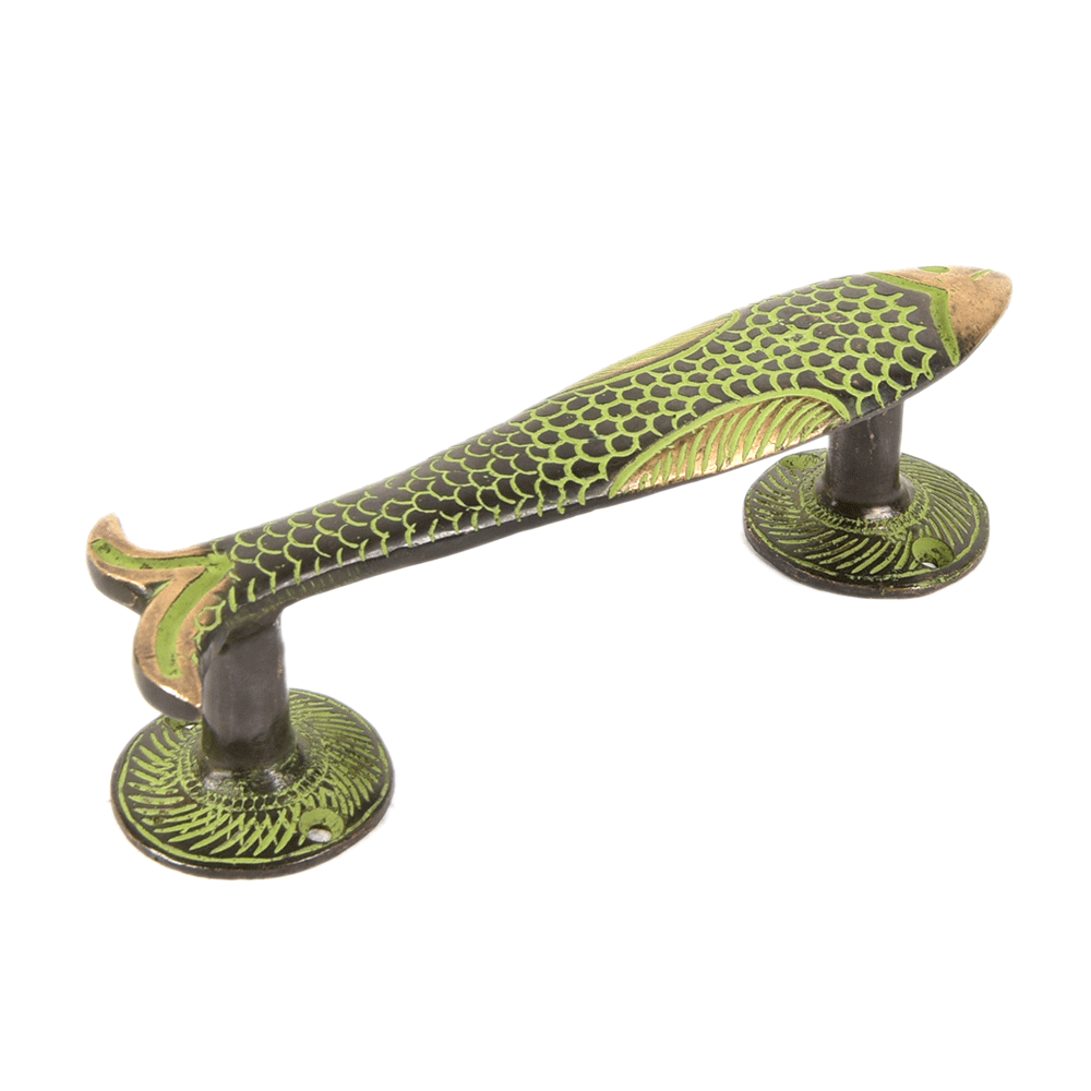 Inlay Carved Fish Shaped Brass Door Handle with Patina. Ideal for Drawer, Dresser, Cabinet, Wardrobe, Cupboard and Almirah.