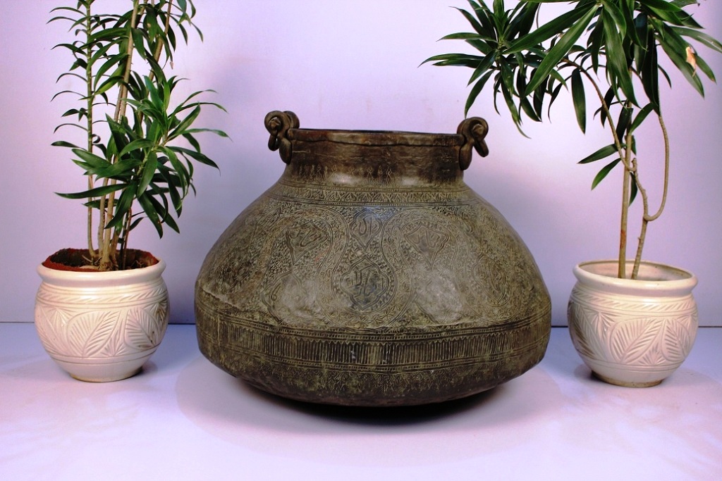 Vintage Copper Planter with ring handles . It is Handmade by Skilled Indian Craftsmen.It has lovely hand carved design of flowers and leaves all over the surface of the planter . The upper portion of the planter has ring handles for lifting. It comes with a natural patina