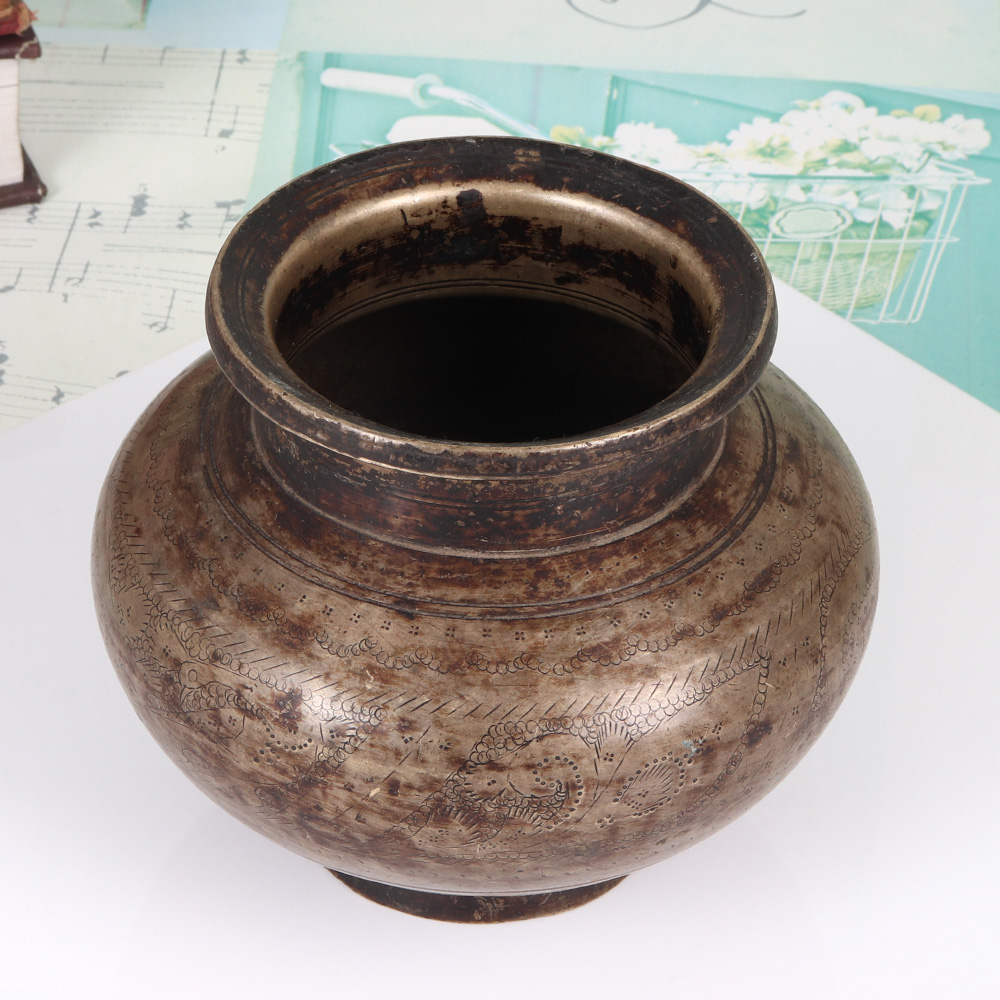 Rituals have the power to ground us, to connect us to the sacred rhythms of the universe. Elevate your rituals with the timeless beauty and spiritual essence of this exquisite brass holy water pot, meticulously crafted by skilled artisans in the cultural heartland of Gujarat, India. Meanwhile, the intricate carvings adorning the exterior lend an air of reverence and ancient wisdom to your spiritual practice. Durable yet elegant, this brass pot will become an indispensable tool in your journey of self-discovery and connection to the divine. Whether you're a devoted practitioner seeking to deepen your spiritual practice, or a lover of fine home decor looking to infuse your space with cultural richness, this vintage brass holy water pot is a must-have addition to your collection. Embrace the power of ritual and let this sacred vessel become an integral part of your mindful, intentional lifestyle.