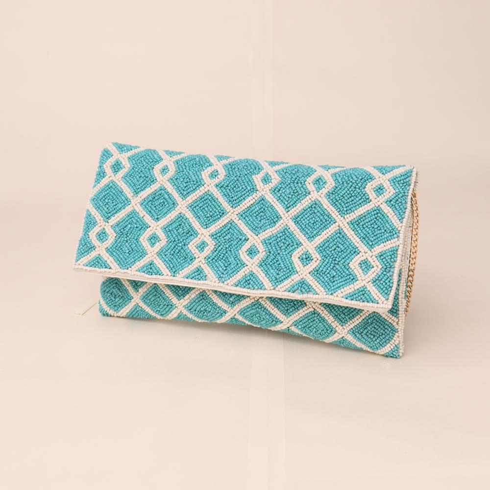 Make a graceful statement with this beautifully hand-beaded clutch featuring a striking lattice design that blends contemporary charm with artisanal detail. Its clean geometric pattern gives it a refreshing elegance, perfect for both daywear and evening occasions. A detachable chain strap lets you wear it hands-free or carry it as a sleek clutch to elevate any outfit.