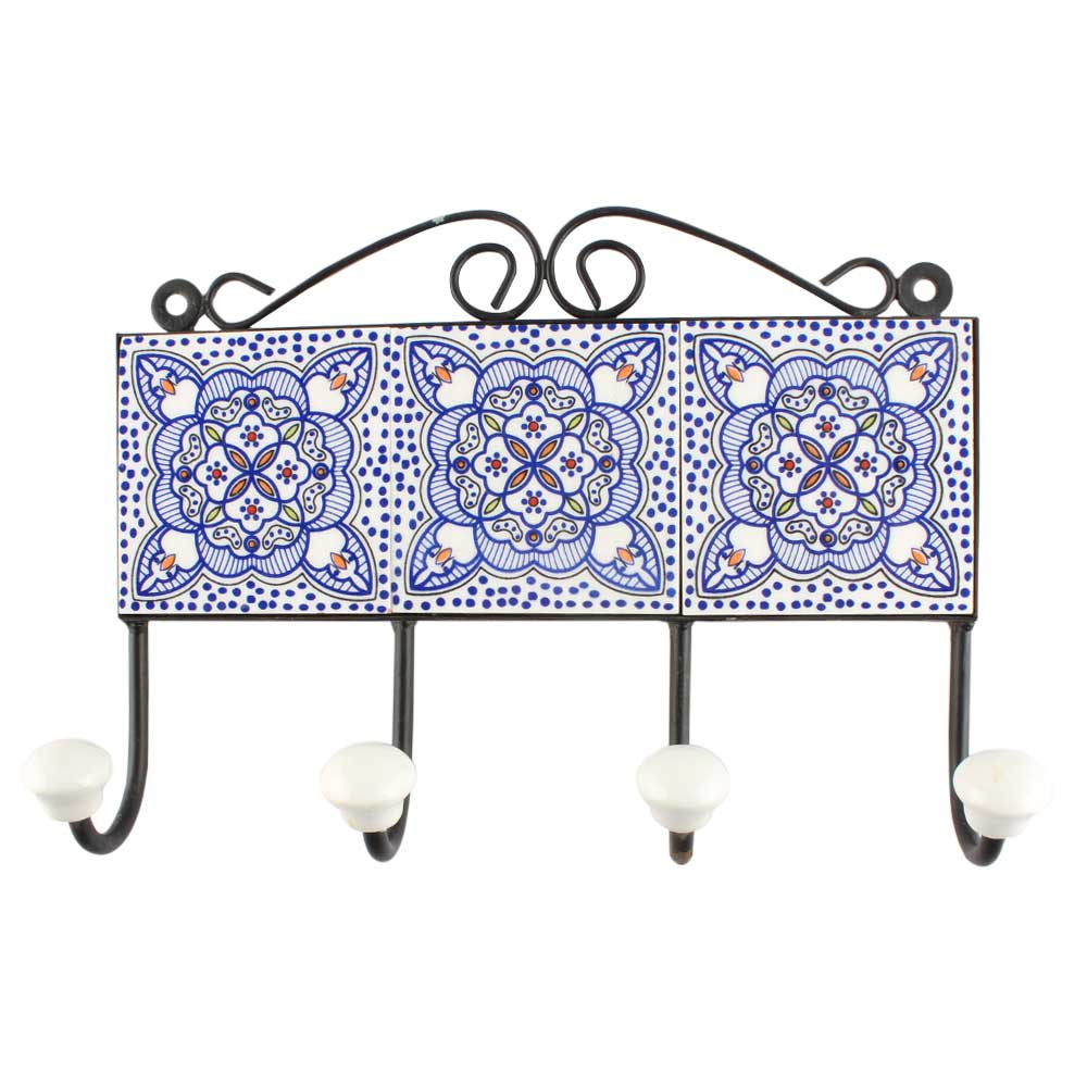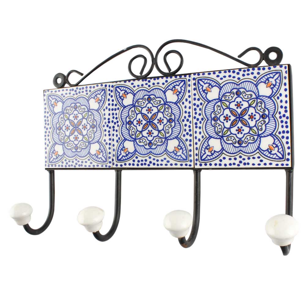 Ceramic Floral Tile Hook in Blue. When Put on Wall or Cabinet It is An Art in Itself. The Metal Part of this Hook is Black Powder Coated.