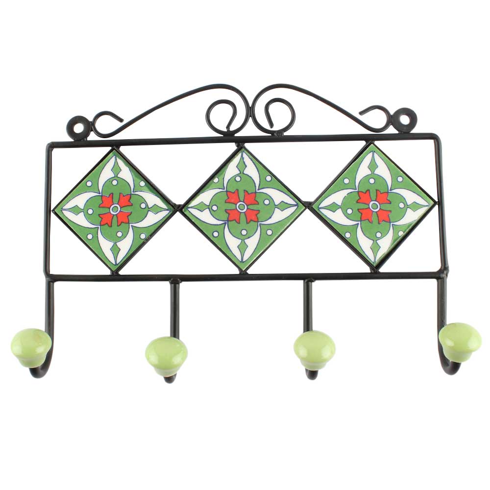 Ceramic Floral Tile Hook in Forest Green. When Put on Wall or Cabinet It is An Art in Itself. The Metal Part of this Hook is Black Powder Coated.