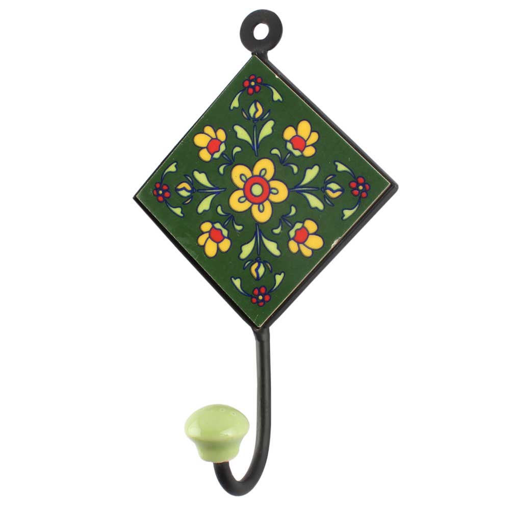 Ceramic Floral Tile Hook in Forest Green. When Put on Wall or Cabinet It is An Art in Itself. The Metal Part of this Hook is Black Powder Coated.