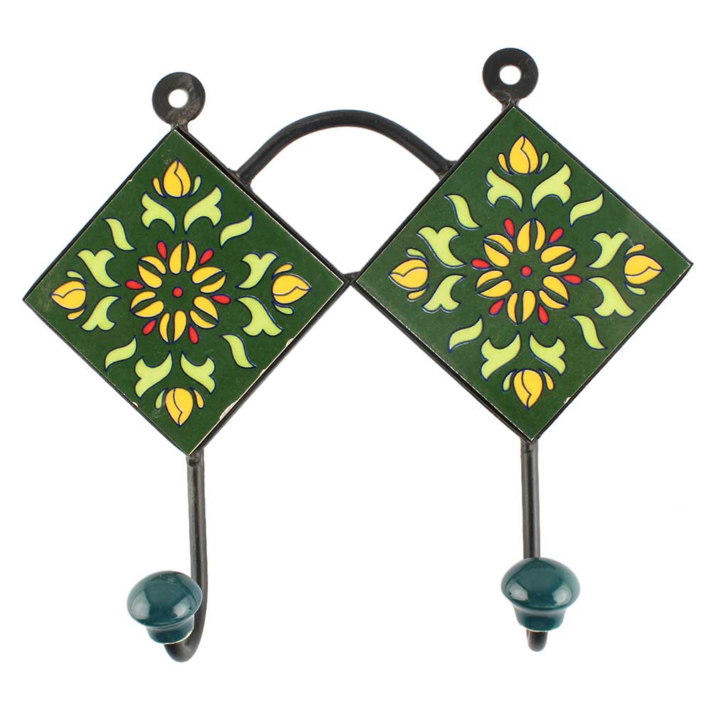 Ceramic Floral tile Hook in Forest Green. When Put on Wall or Cabinet It is An Art in Itself. The Metal Part of this Hook is Black Powder Coated.