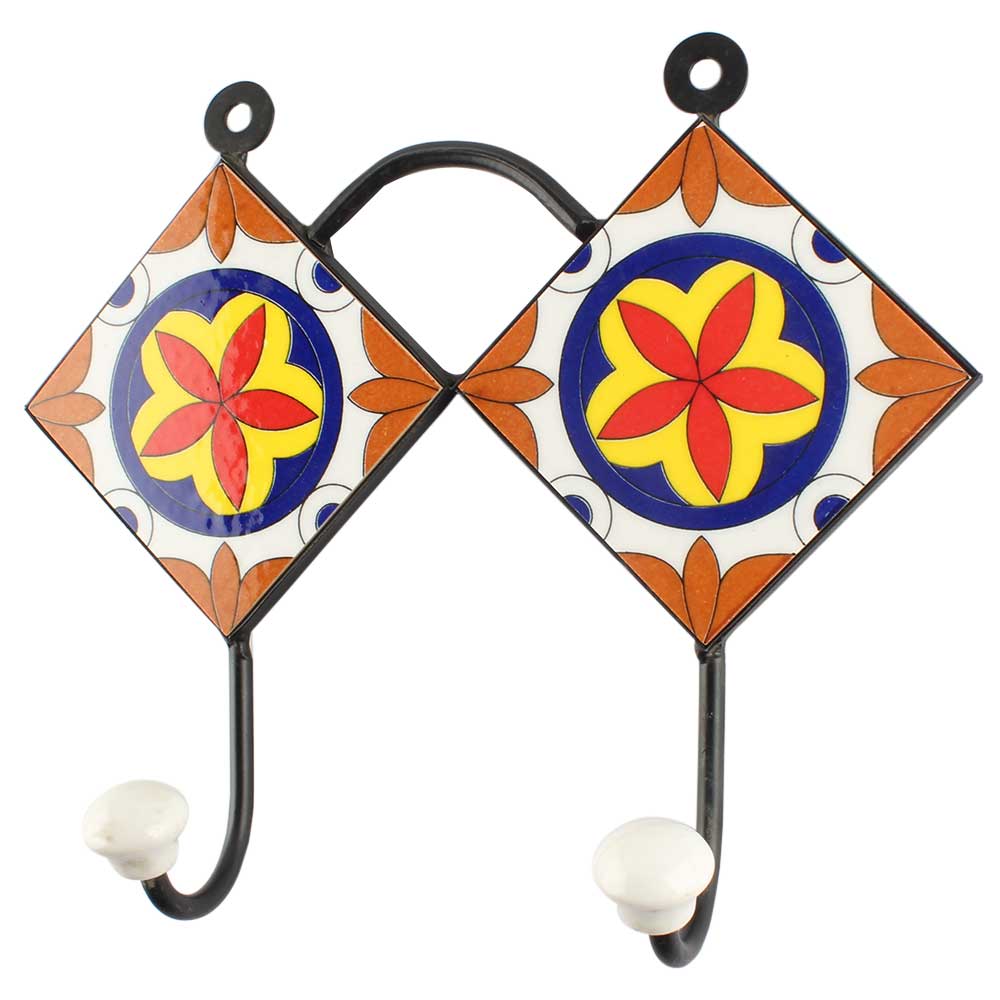 Ceramic Floral Tile Hook in Orange. When Put on Wall or Cabinet It is An Art in Itself. The Metal Part of this Hook is Black Powder Coated.