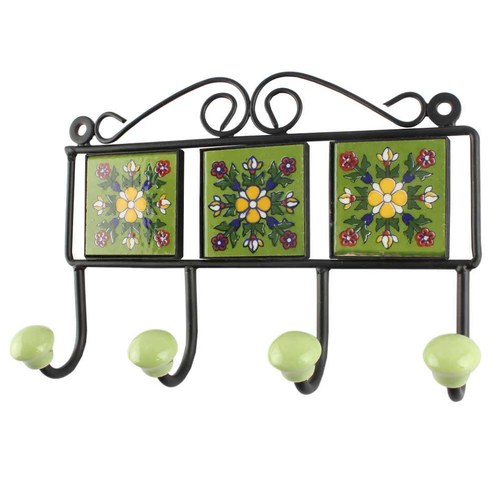 Ceramic Floral Tile Hook in Pea Green. When Put on Wall or Cabinet It is An Art in Itself. The Metal Part of this Hook is Black Powder Coated.
