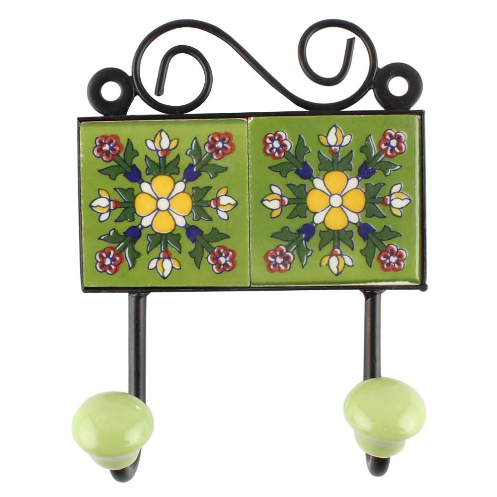 Ceramic Floral Tile Hook in Pea Green. When Put on Wall or Cabinet It is An Art in Itself. The Metal Part of this Hook is Black Powder Coated.