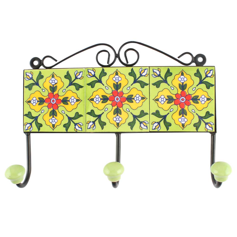 Ceramic Floral Tile Hook in Pea Green. When Put on Wall or Cabinet It is An Art in Itself. The Metal Part of this Hook is Black Powder Coated.