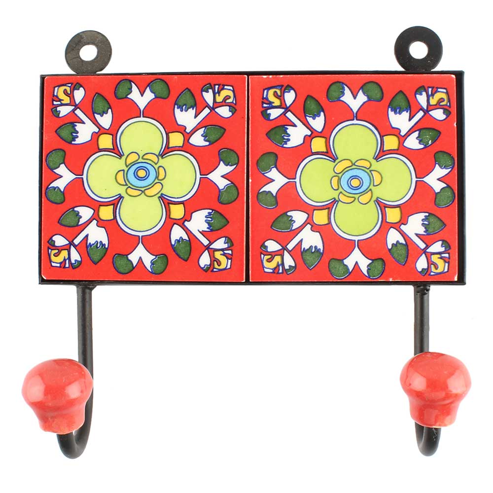 Ceramic Floral Tile Hook in Red. When Put on Wall or Cabinet It is An Art in Itself. The Metal Part of this Hook is Black Powder Coated.