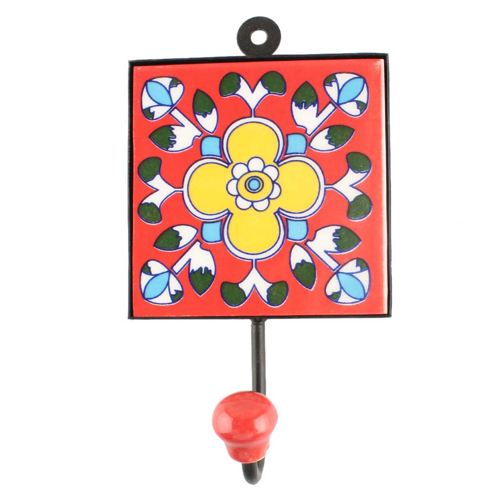 Ceramic Floral Tile Hook in Red. When Put on Wall or Cabinet It is An Art in Itself. The Metal Part of this Hook is Black Powder Coated.
