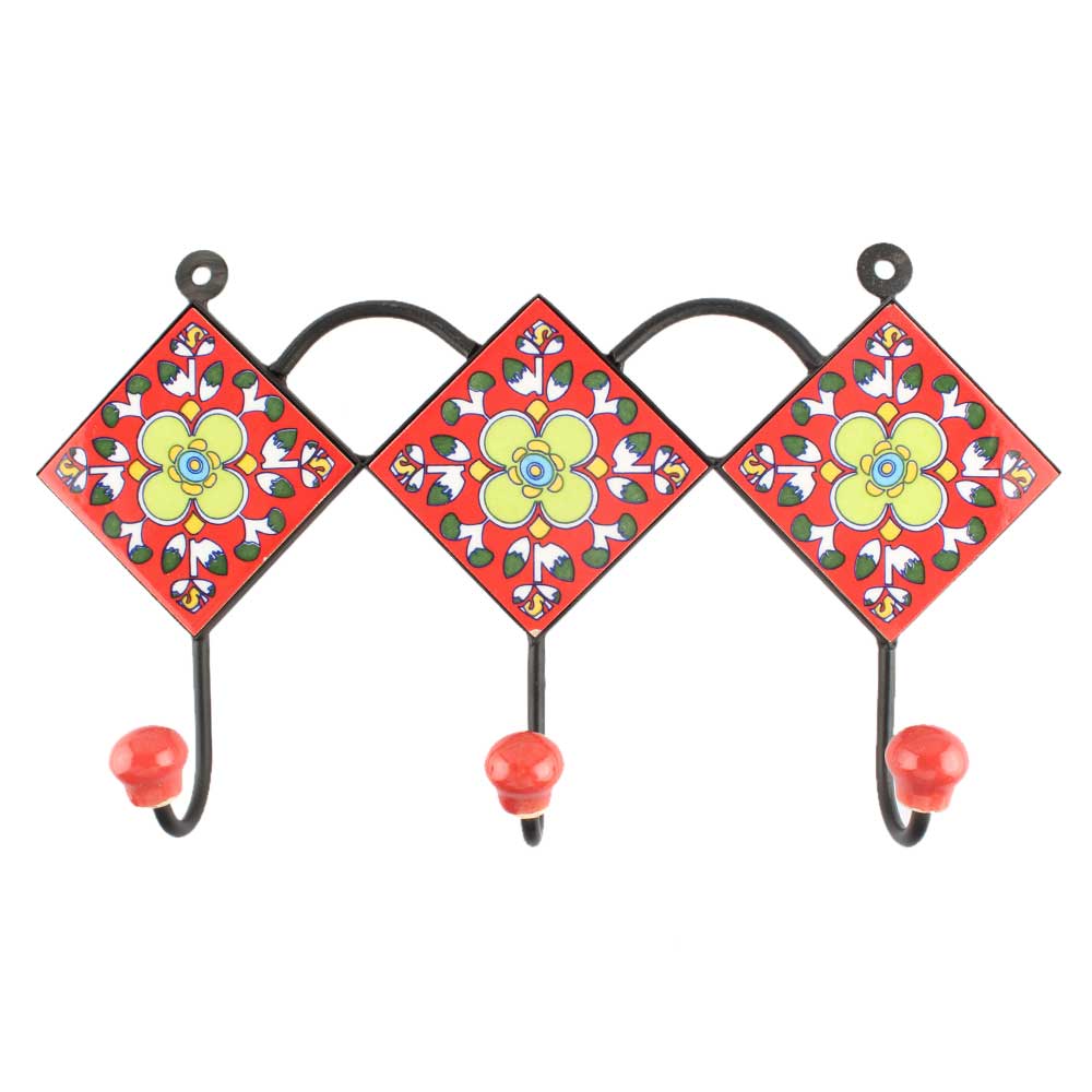 Ceramic Floral Tile Hook in Red Color. When Put on Wall or Cabinet It is An Art in Itself. The Metal Part of this Hook is Black Powder Coated.