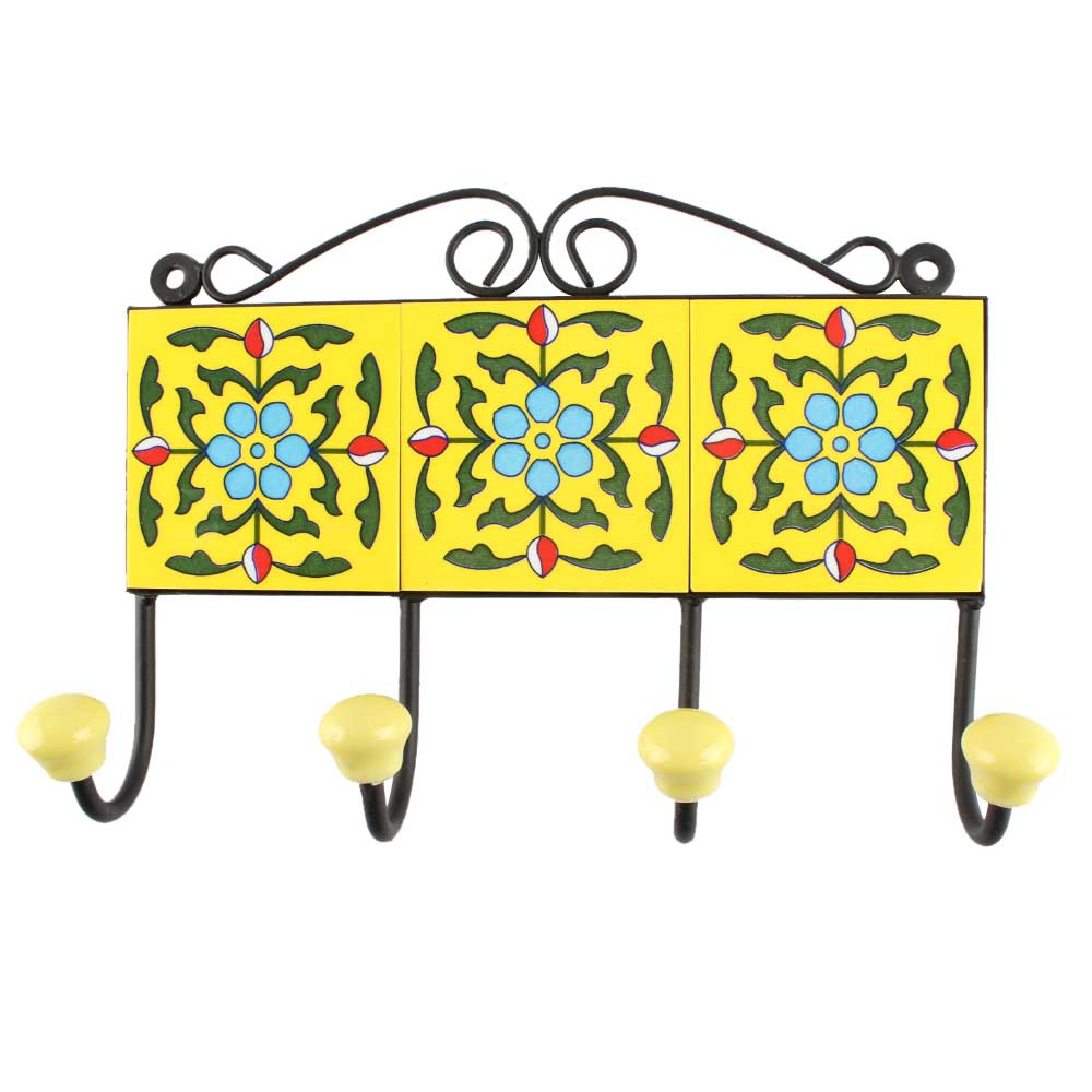 Ceramic Floral Tile Hook in Yellow. When Put on Wall or Cabinet It is An Art in Itself. The Metal Part of this Hook is Black Powder Coated.