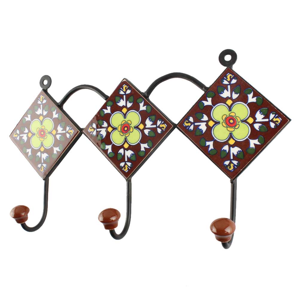 Ceramic Floral Tile Wall Hook in Dark Brown. When Put on Wall or Cabinet It is An Art in Itself. The Metal Part of this Hook is Black Powder Coated.