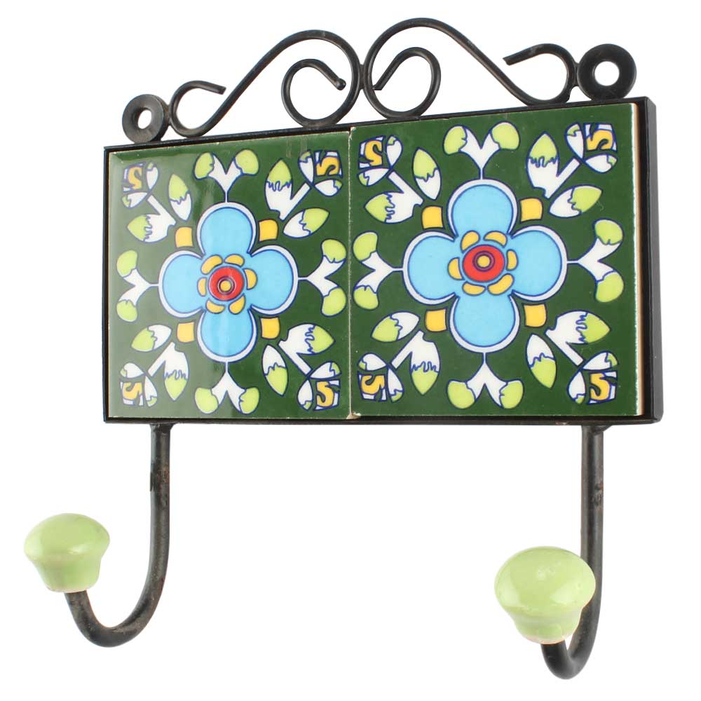 Ceramic Floral Tile Wall Hook in Forest Green. When Put on Wall or Cabinet It is An Art in Itself. The Metal Part of this Hook is Black Powder Coated.