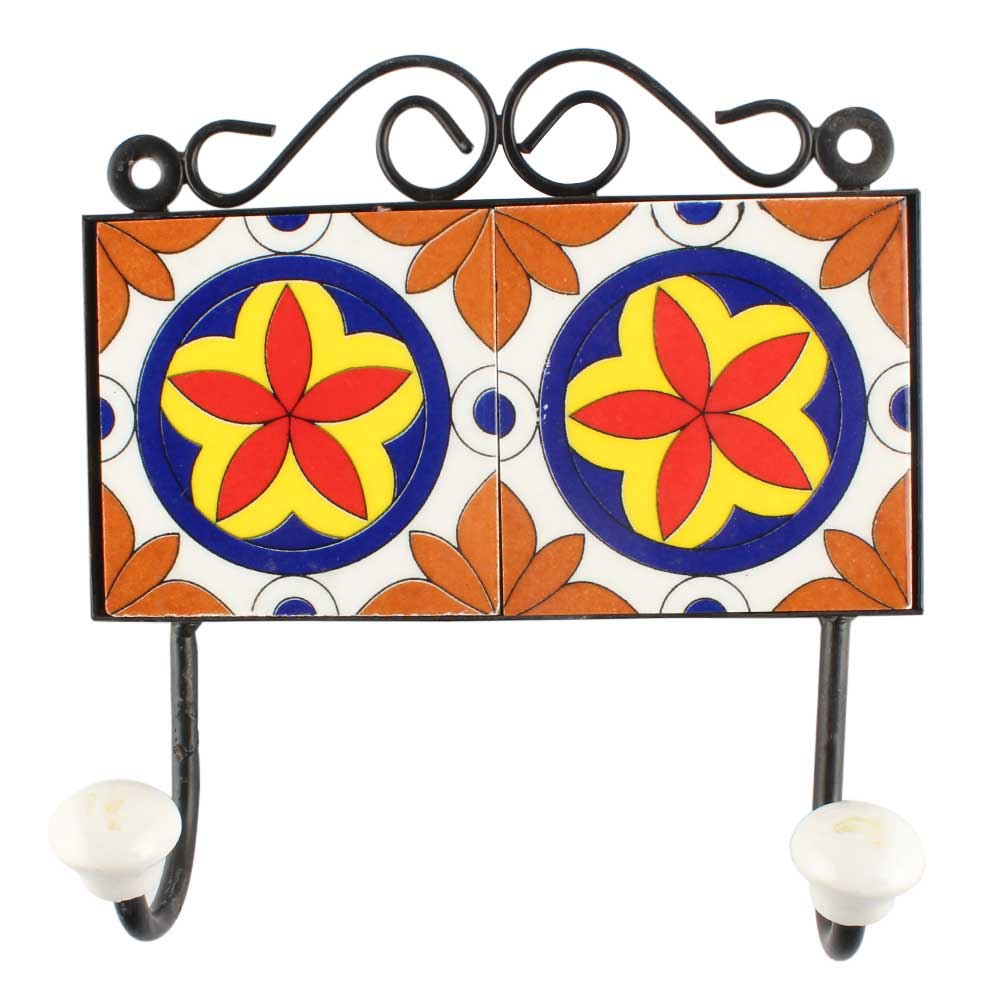 Ceramic Floral Tile Wall Hook in Orange. When Put on Wall or Cabinet It is An Art in Itself. The Metal Part of this Hook is Black Powder Coated.