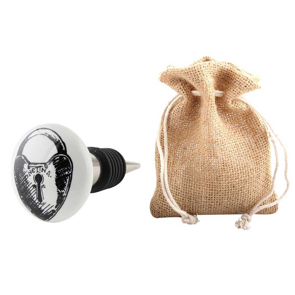 Ceramic Painted Lock Wine Bottle Stopper. Zinc Alloy Wine Bottle Stopper with Attractive Jute Bag Packaging.