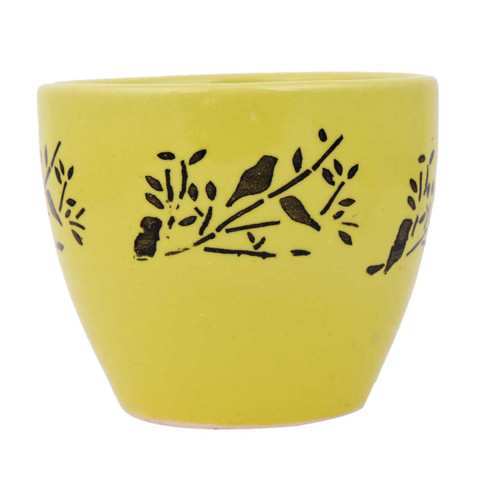 Ceramic Pot Hand painted With Yellow And Black With Small Birds On Branch to accentuate the beauty of your home, office and other commercial places, used in nursery, garden and lawn decoration, lace your herb and apices and an excellent wedding and Diwali gift for your near and dear ones.