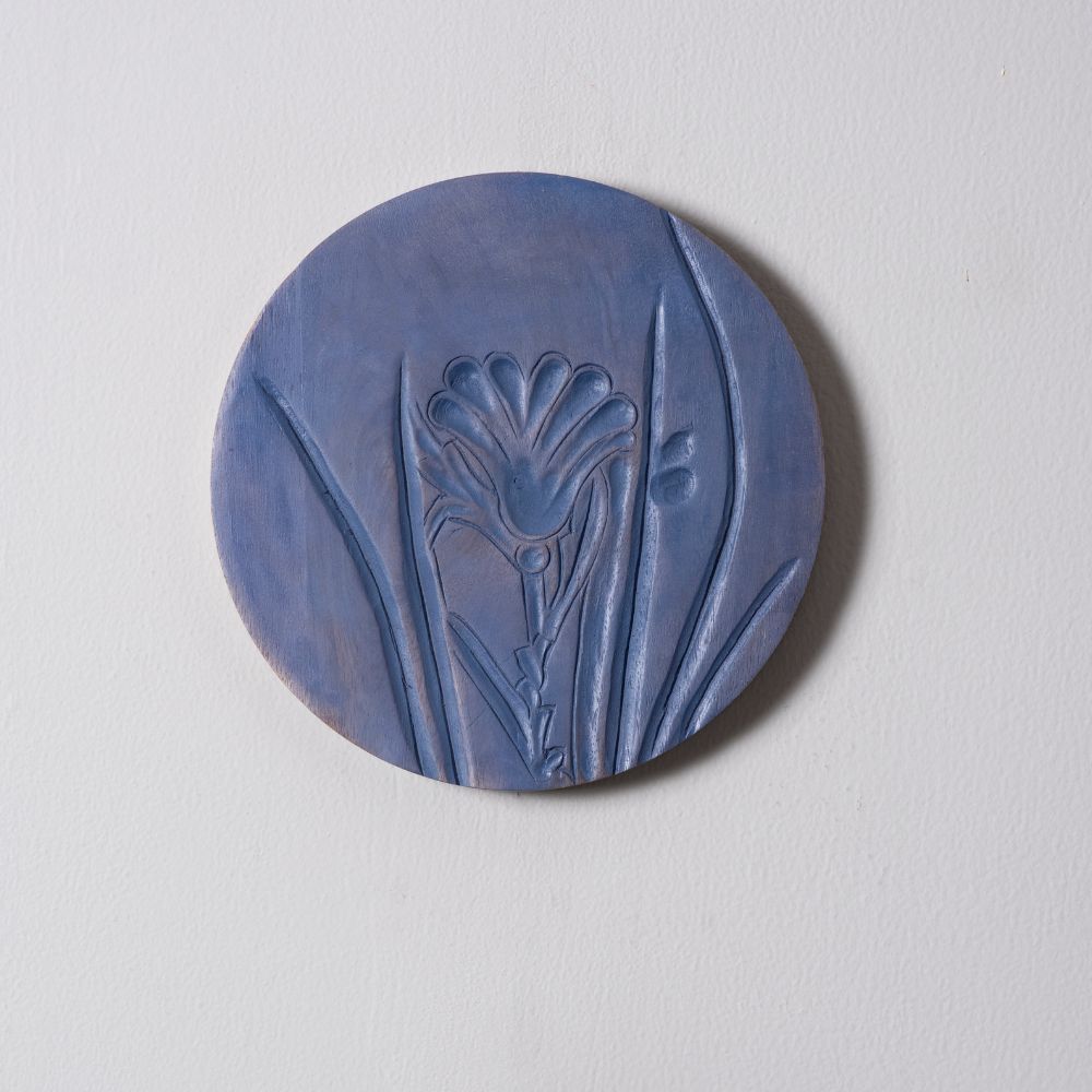 A round handcrafted plate featuring a graceful floral carving with a deep blue tone that brings calming charm to any wall.