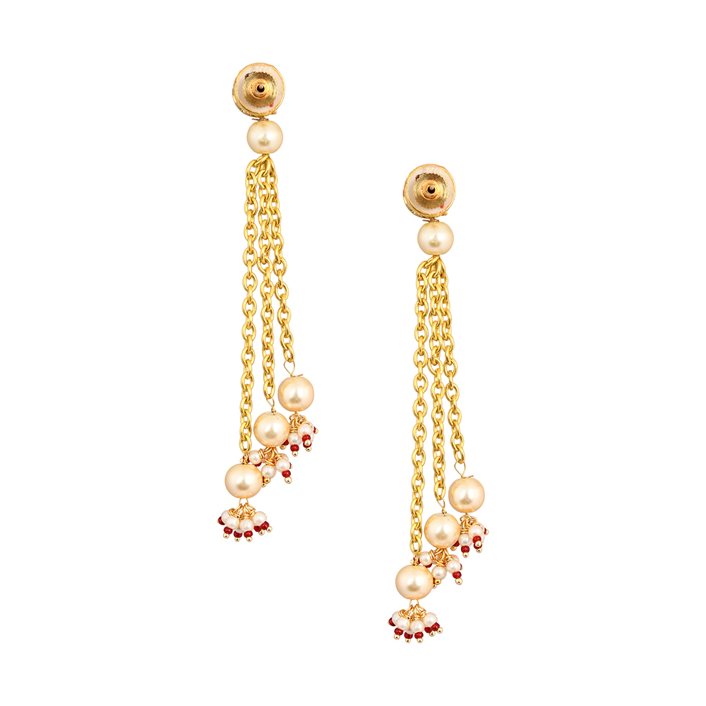 Celebrate modern elegance with our handcrafted Chain & Pearl Drop Cascade Earrings with Red Bead Clusters. These eye-catching earrings feature a mirrored stud and a luminous pearl from which multiple gold chains gracefully cascade. Each chain ends in a polished pearl and a cluster of tiny red and white beads, adding subtle sparkle and movement. Perfect for weddings, festive occasions and thoughtful gifting, they bring graceful sophistication to any outfit.