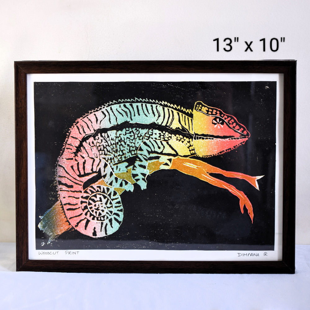 A bold and vibrant woodcut print of a chameleon, showcasing its unique form and texture with intricate detailing and a striking gradient of pastel hues against a deep black background. The print features shades of orange, yellow, green, and pink that flow across the body, reflecting the chameleon’s natural ability to adapt and transform. This hand-printed artwork captures both the creature’s visual beauty and symbolic meaning of change and versatility — a perfect piece for modern, eclectic, or nature-inspired interiors.