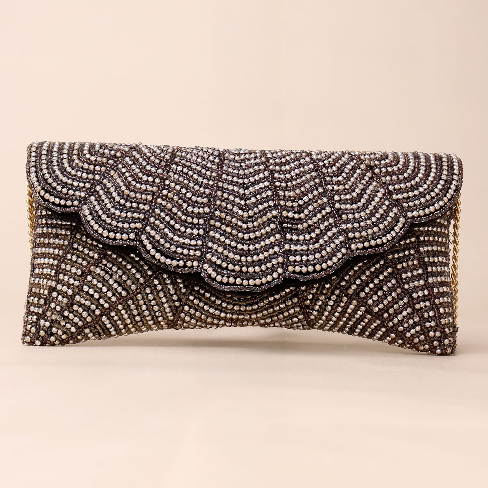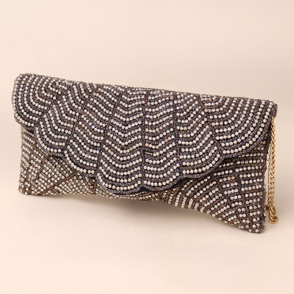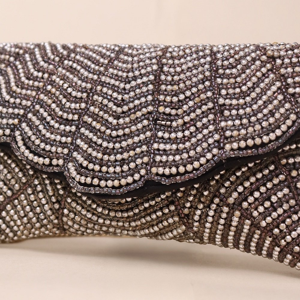 Turn heads with this beautifully hand-beaded sling bag featuring a scalloped flap and intricate chevron pattern. Perfectly combining vintage charm with modern elegance, this handcrafted clutch adds a luxe shimmer to your festive, cocktail, or evening attire. With a structured silhouette, soft lining, and metallic chain strap, this bag is as functional as it is stylish—making it a go-to choice for weddings, receptions, and special occasions.