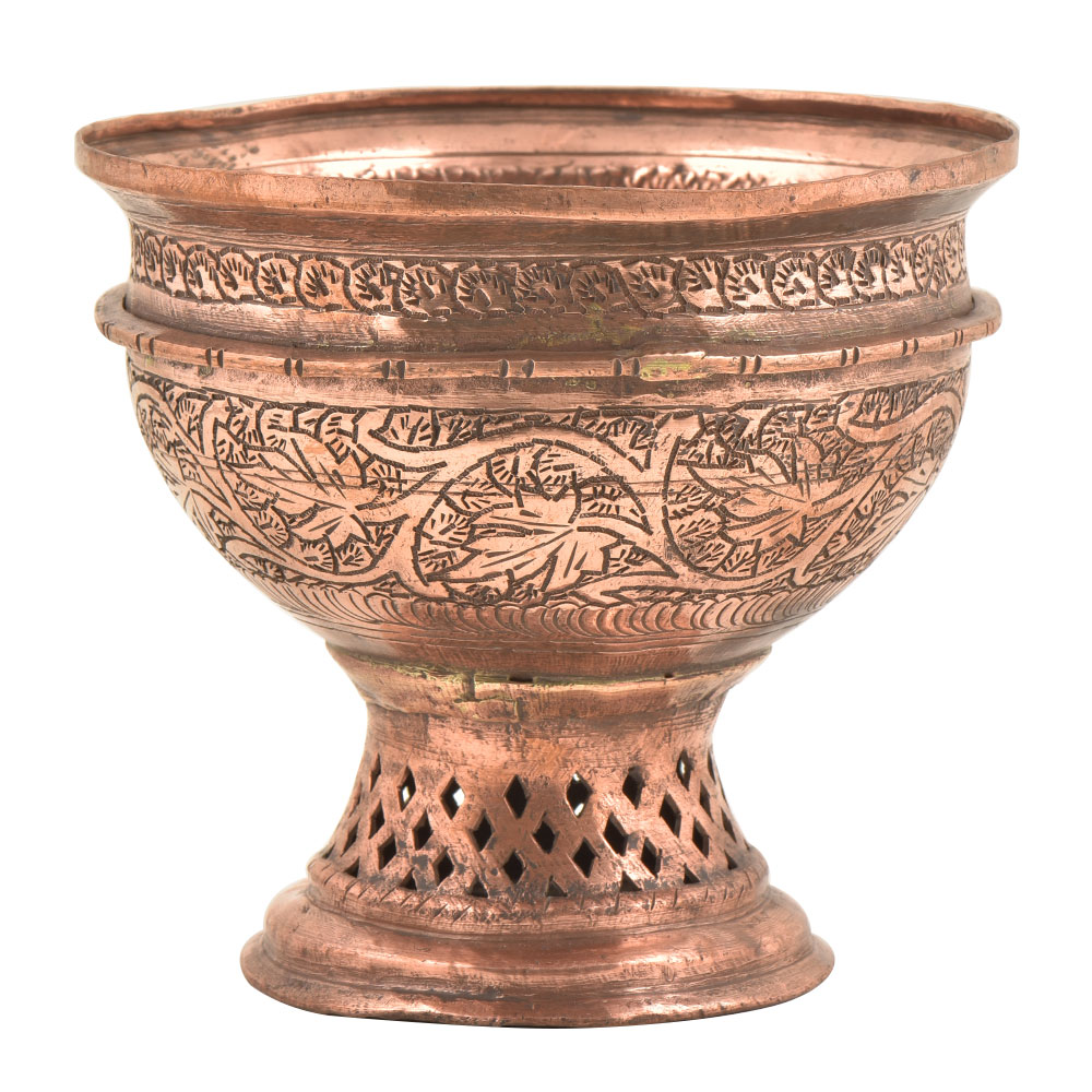 Spruce up and bring grace to your kitchen by the fine addition of this chinar carved Kashmiri copper bowl. With a simple circular handleless contour, it can be used for serving nuts and dry fruits or any delicacy of your choice.