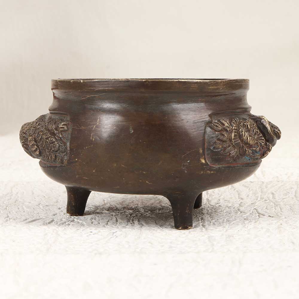 Channel the exotic bazaars of ancient China with this ornately carved vintage brass pot. Sitting atop three sturdy legs, this sculptural accent piece features a weathered brown patina and handcrafted details that evoke Far East treasure. This one-of-a-kind pot reflects the artistry of ancient oriental craftsmanship. Its rich brown finish and intricate details look like a relic found in a Chinese marketplace. Perfect for mini plants like succulents or air plants, it also shines as a decorative object that adds global allure. Place this pot's exotic silhouette on your console table, mantle, or anywhere your home needs an artistic accent. Ideal for collectors of Asian antiques, global decor lovers, or anyone seeking a touch of chinoiserie style. This versatile pot functions beautifully as a planter or just as decor, making it a meaningful addition that invokes old world Far East charm.
