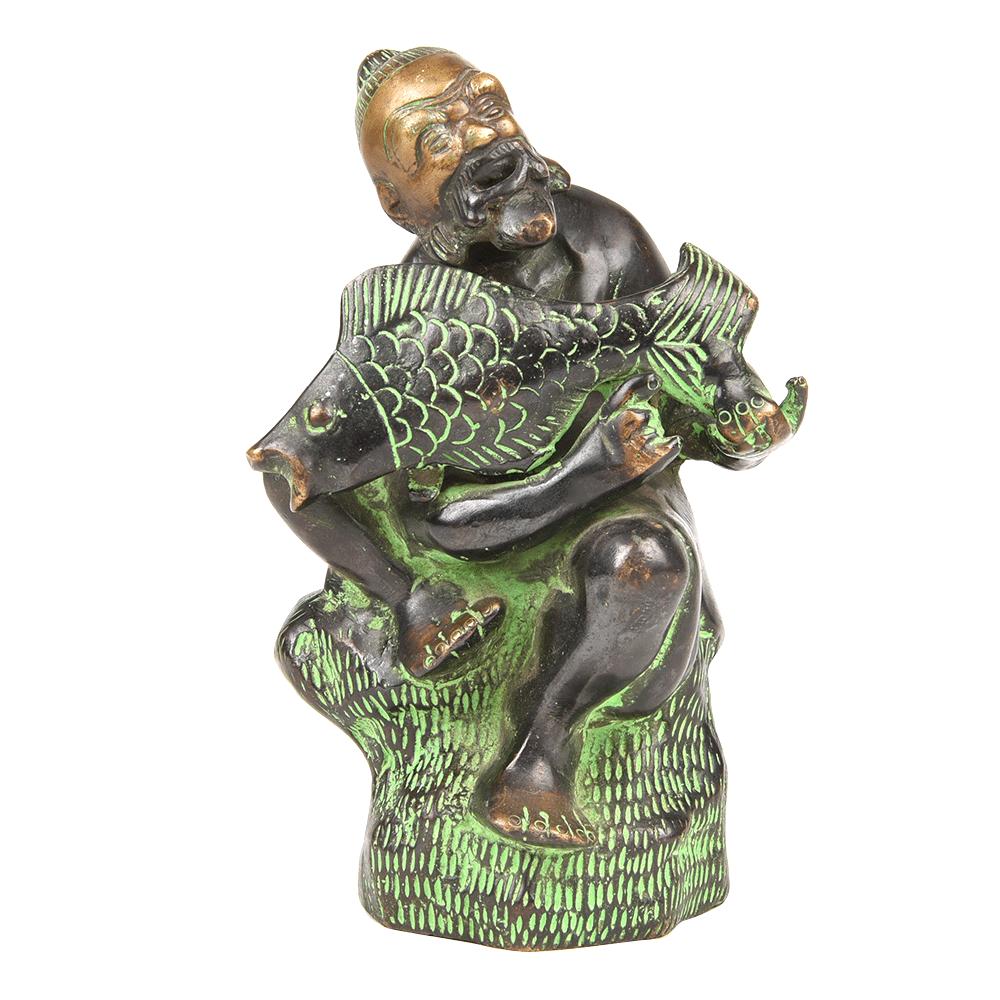 Chinese Bronze Fisherman Sculpture Figurine Fish Basket Holding Fish.