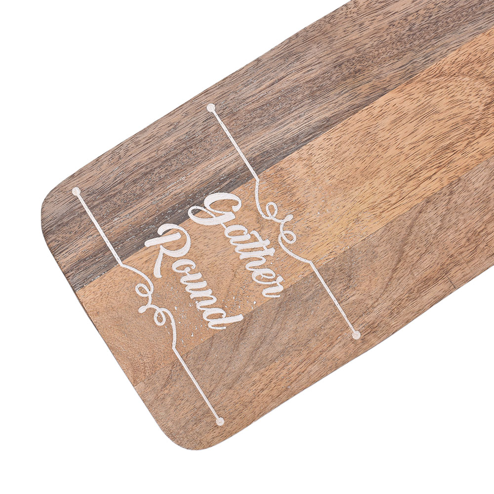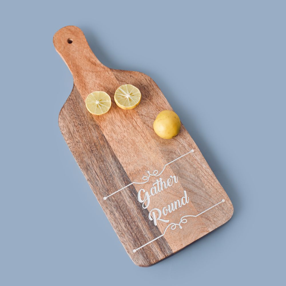 Wooden chopping board provides a workspace for cutting meat, slicing fruit, and heavy-duty vegetable cutting. High-quality wood resists warping and scarring from knives. Excellent for dicing, cutting, chopping, and serving food. These may be utilised while cooking on the kitchen counter. Cutting boards made of hardwood are customary and are kind to blades. Natural Wood, Unpolished, Uncolored, with No Additional Stains or Dyeing. Your costly blades won't go dull due to the fibres in wood. Use a wooden cutting board to quickly and comfortably chop vegetables, fruits, fish, meat, cheese, and other meals. It has a handy handle, making it a perfect complement to the kitchen.
