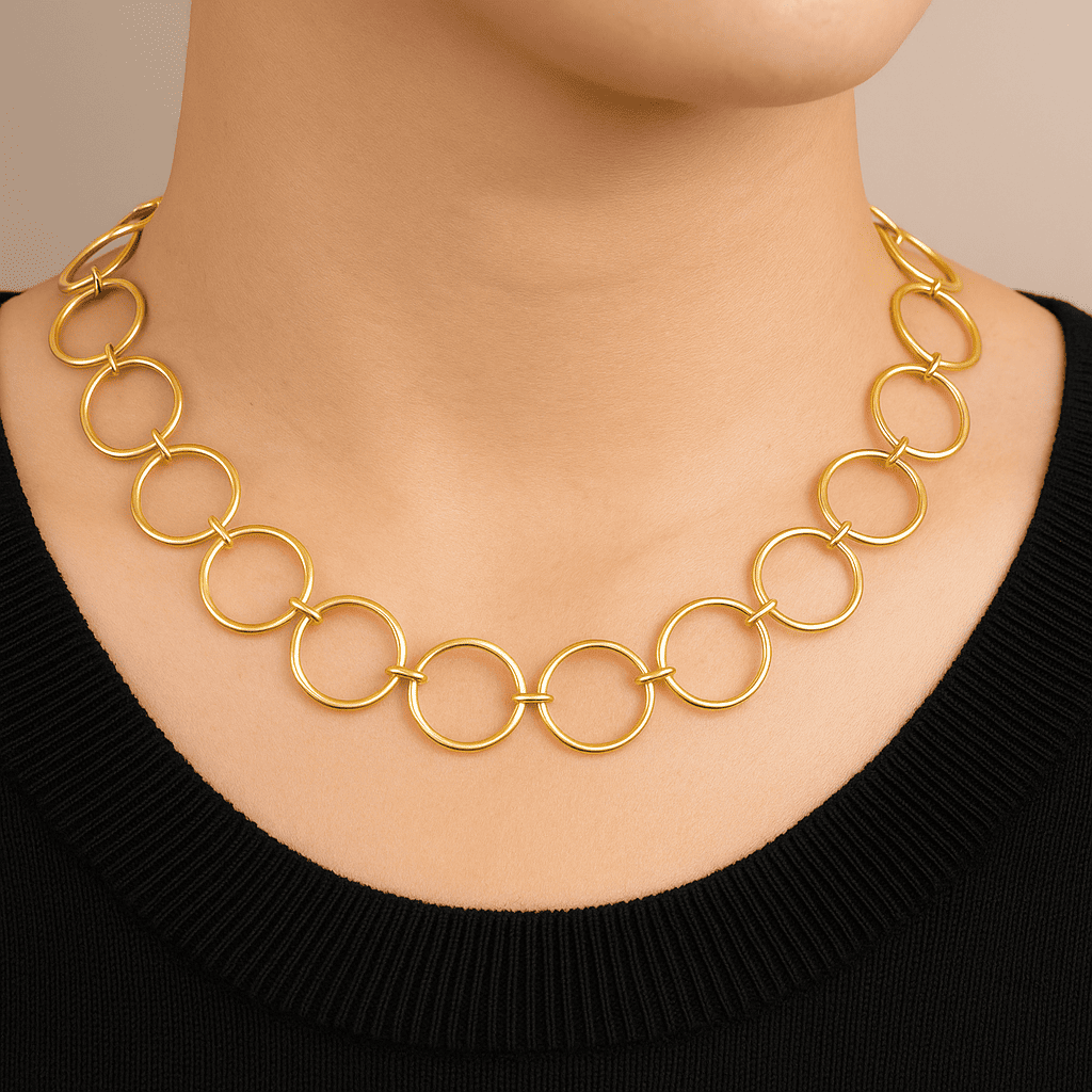 Keep the necklace dry and wipe gently after use to maintain its gold sheen and smooth circular surface.