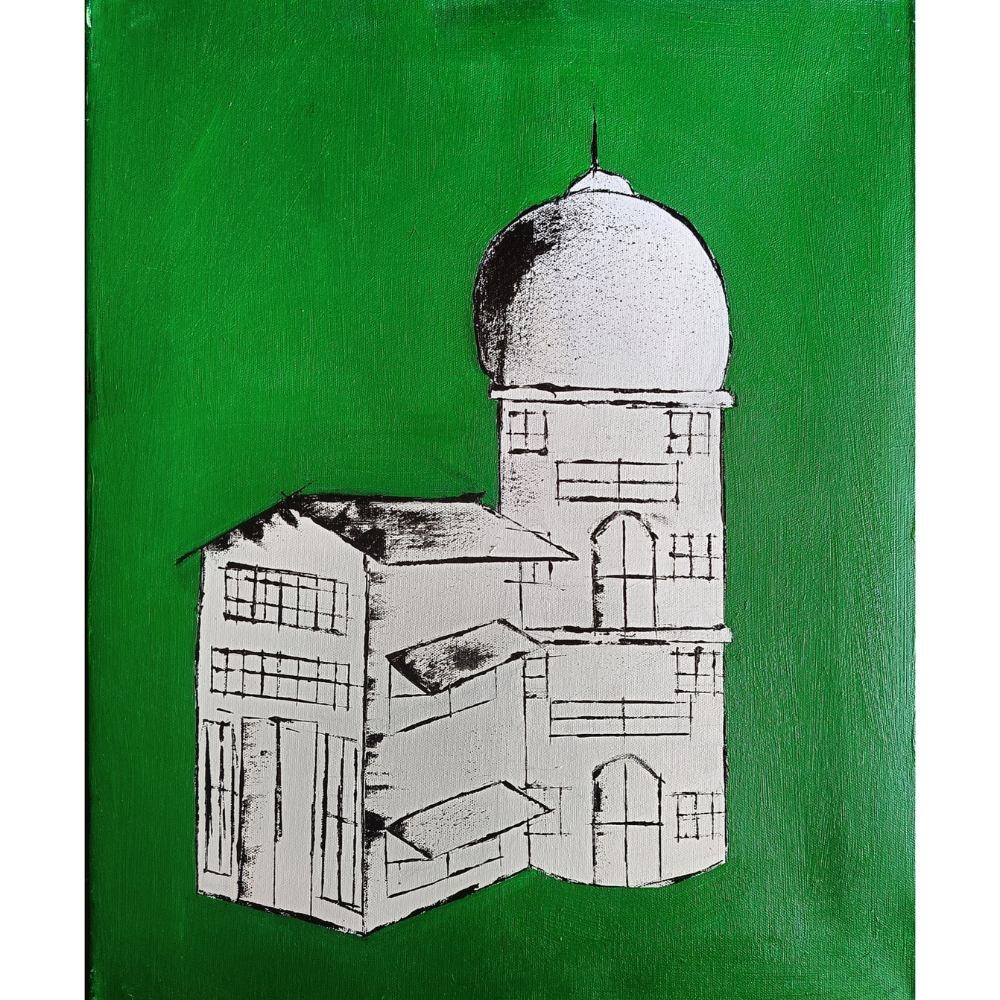 In Cityscape – Dome of Silence, artist B. Manikanta captures a moment of architectural solitude with sharp contrast and striking simplicity. Painted in oil on a compact 1 x 1.5 feet canvas, the artwork features two stark, monochromatic structures—one crowned with a domed rooftop—emerging from a vivid green background. The precise linework and geometric balance offer a meditative stillness, while the green evokes a quiet vitality amidst structural rigidity. With minimal elements, B. Manikanta reflects on identity, heritage, and urban isolation—turning city structures into contemplative forms. An elegant piece for lovers of modern architectural minimalism and symbolic cityscape