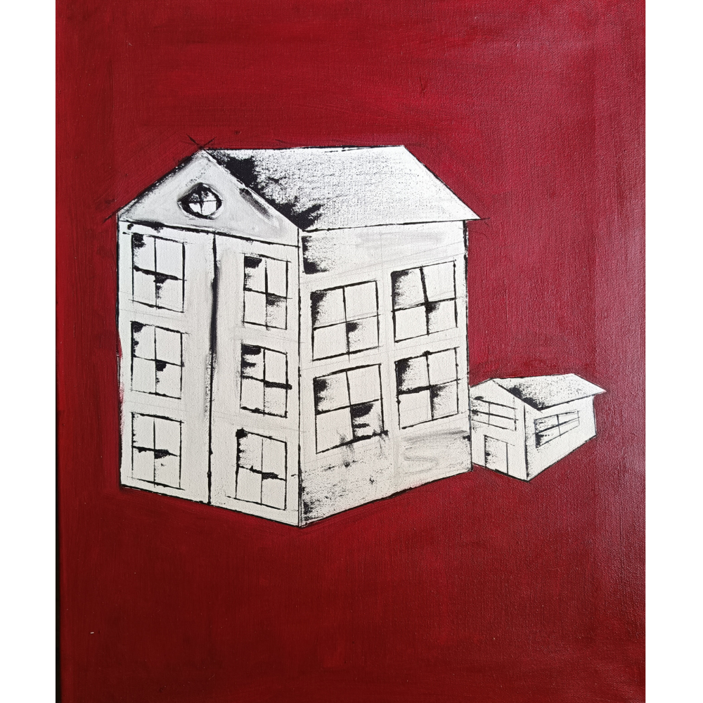 Cityscape – Isolated Forms by artist B. Manikanta presents a bold and introspective study of space, solitude, and structural simplicity. Set against a deep crimson background, the 1 x 1.5 feet oil on canvas features two monochromatic buildings—one tall and detailed, the other modest and quiet. The minimalism of the forms contrasts powerfully with the intensity of the red, evoking themes of urban isolation and individual identity within the vastness of the city. With sharp outlines and a deliberate absence of clutter, Manikanta invites the viewer to contemplate the quiet narratives of architecture and presence. A striking, compact work for lovers of conceptual minimalism and expressive urban studies.